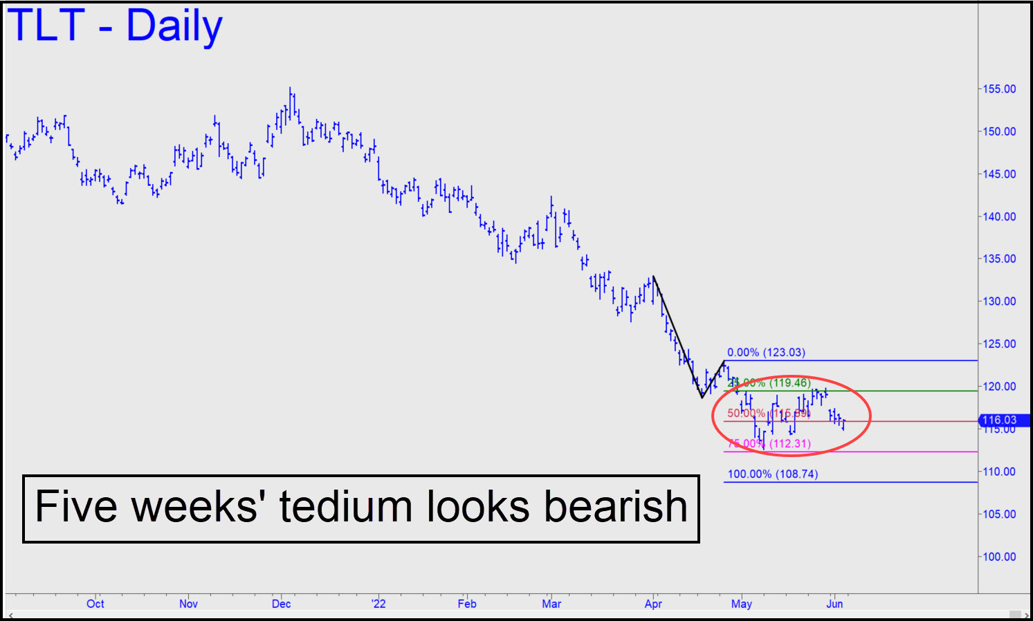 Five weeks of tedium have etched a picture of distribution on the daily chart (inset), presumably culminating with a dive at any time to the 108.74 target of the pattern shown. This suggests that my forecast for a major top in Ten Year rates at 3.24% may eventually be borne out. The so-far high at 3.17 reached on May 9 was close enough for us to have considered the target fulfilled. However, we should keep an open mind toward the possibility of a head fake corresponding to an important peak in rates. If so, it would portend deepening recession for the U.S. and the world. ______ UPDATE (Jun 13, 10:53 a.m.): I’ve adjusted the target upward to 3.56 using a less gnarly pattern in $TNX.X, a vehicle that tracks interest rates tied to the Ten-Year Note.