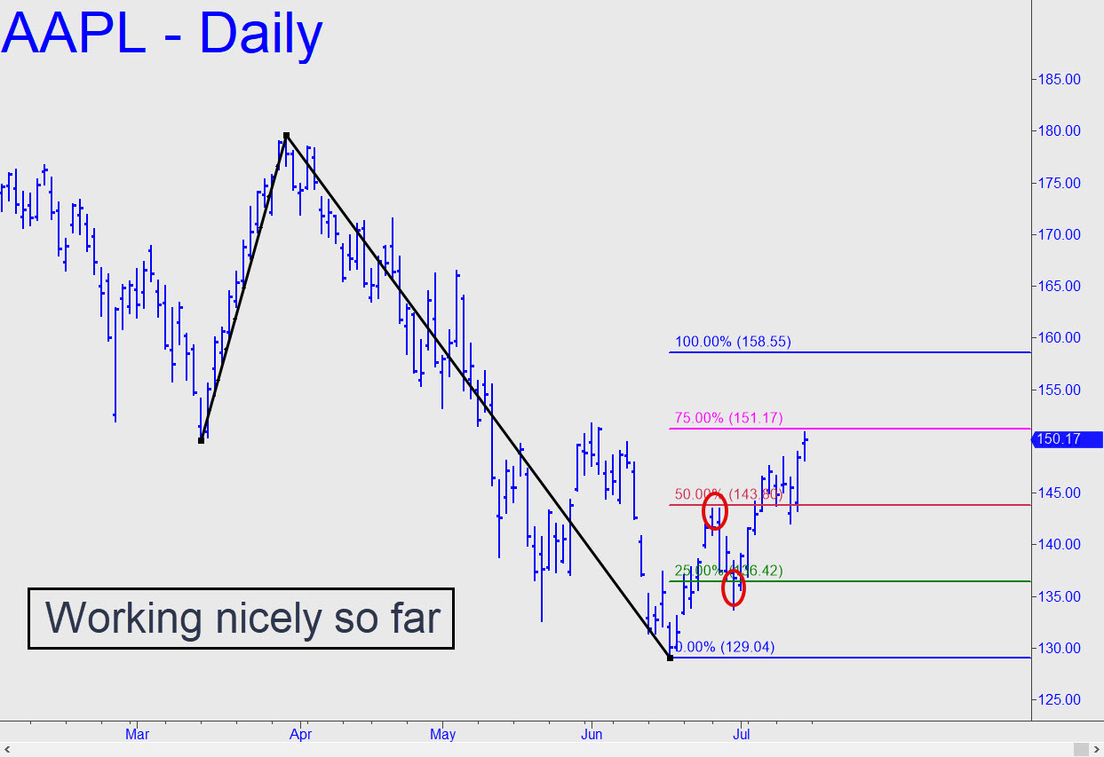 Conventional patterns project rally targets that seem too ambitious, so I’ve settled on an rABC that allows upside over the near term to a relatively modest 158.55. This should be an easy trek, but I would still consider shorting near the target with a ‘camouflage’ set-up that risks no more than 12 to 20 cents a share initially. A sign that the pattern is working is the winning ‘mechanical’ buy at the green line. Don’t pass up a second opportunity to buy there, stop 129.03, if the stock should unexpectedly revisit it by Wednesday. _______ UPDATE (Jul 18, 18:03): If AAPL is about to reclaim its usefulness as a market bellwether, it should deliver a ‘mechanical’ winner from the red line (p=143.80). The trade would require a stop-loss at 138.88, but I’d suggest paper trading if you are developing your ‘mechanical’ chops or just curious to see how well these trades work. _______ UPDATE (Jul 19, 10:22 p.m.): AAPL did in fact lead the way, but with a nasty short squeeze on the opening bar rather than a shakedown. The target at 158.55 is not quite a lock-up, but it is a good enough bet to suggest the broad averages are likely to move higher for the next 2-3 days.