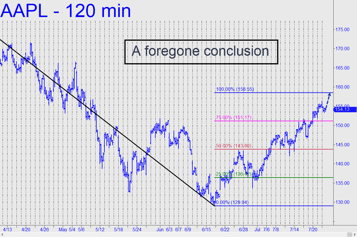 AAPL looks all but certain to reach the 158.55 rally target we’ve been using for the last few weeks. Will it overshoot the Hidden Pivot, presaging a possible test of March’s watershed high at 178? I doubt it, but we should be prepared for an outbreak of irrational exuberance nonetheless, since it would be short-covering all the way, impelled and manipulated by chimps who have lived on autopilot almost solely from AAPL’s long bull market. They were never going to just roll over, and what we are seeing is a distribution for which they have been conducting drills and test runs, starting with a stock split that brought the price down to a level that the rubes could afford.
