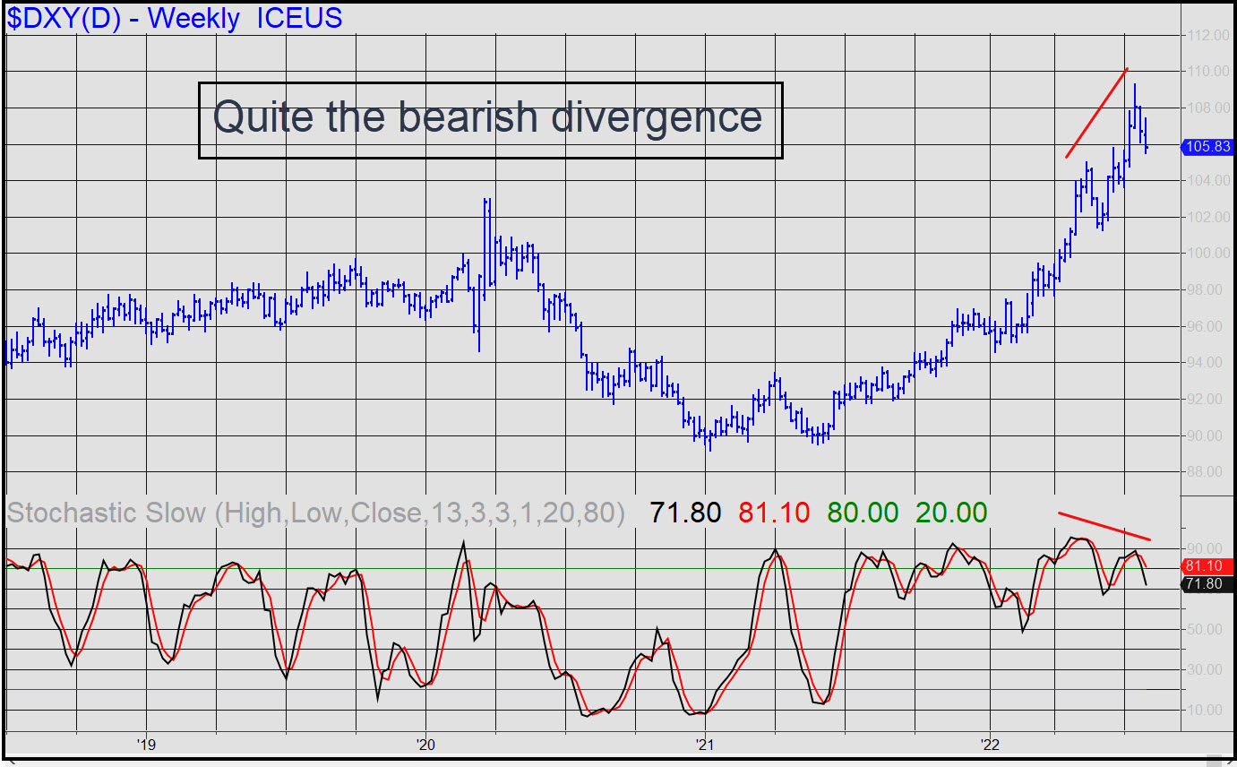 This correction could turn out to be be the most significant since the Covid outbreak in 2020. Higher peaks this spring diverged from lower stochastic peaks, as you can see. This is quite bearish and portends more weakness until the stochastic lines reach the oversold zone between zero and 20. There are no obvious Hidden Pivots target below, but an imaginative reading of the weekly chart suggests the dollar could grope its way down to as low as 97.63 in search of bottom. That would represent an ostensibly healthy, 10% correction from the 109.29 high recorded a few weeks ago. It would probably be misread as the dollar’s death knell, but from a technical standpoint the retracement could prepare the buck for a rally strong enough to usher in an era of deflation that seems inevitable.