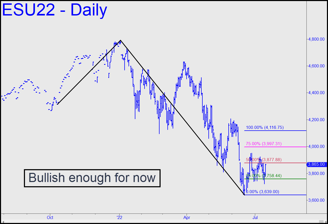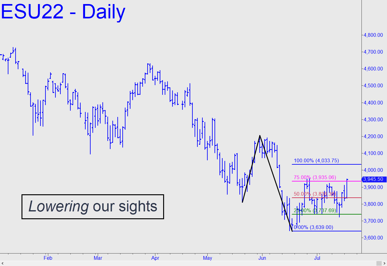 Shorts were under intense pressure to cover as the week ended after getting squeezed for two consecutive days without a chance to rest. For all the pain the 148-point rally may have caused bears, it barely registered a blip on the daily chart. No prior peaks were surpassed; moreover, it would require a further upthrust of 326 points to generate an impulse leg on the daily chart. Even so, I’ve given the bull the benefit of the doubt with the most ambitious target (see inset) that can be projected using a ‘reverse pattern’. It lies at 4116.75, although a move to that number cannot be considered a lock-up because p=3877 has been pounded without giving way The pattern itself has been working nicely for trading purposes, having produced two $24,000 ‘mechanical’ winners acquired at the green line. ______ UPDATE (Jul 18, 7:43 p.m. EDT): A dip to x=3758 would trip a third ‘mechanical’ buy, but the odds looked better when two similar trades were triggered earlier this month. Getting short is no piece of cake either, as anyone who has attempted it during the last three sessions will have surmised. _______ UPDATE (Jul 19, 5:30): Frenzied shorts continued to machine-gun themselves in the foot, so perhaps it’s a good time to LOWER our sights lest we get caught up in the madness. Although the 4116.75 target noted above will remain valid, I’ll suggest focusing on a lower Hidden Pivot resistance at 4033.75 derived from this pattern. We’ll want to try shorting there in the usual, risk-averse ways. I’ll also introduce 4256 as a ‘discomfort zone’ objective in case there are still a few bears stupid enough to hang on for dear life above 4116.75. Here, in summary, are the tradeable obstacles above: 4033.75, 4116.75 and 4256. As always, a decisive move past one will imply the next is likely to be reached.