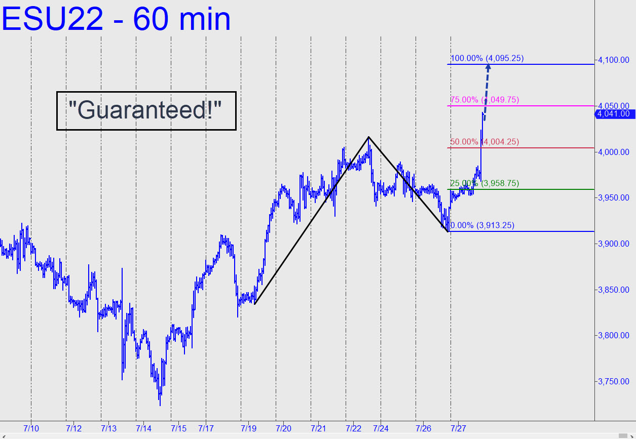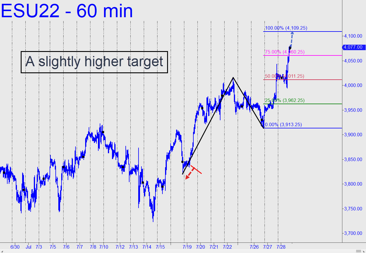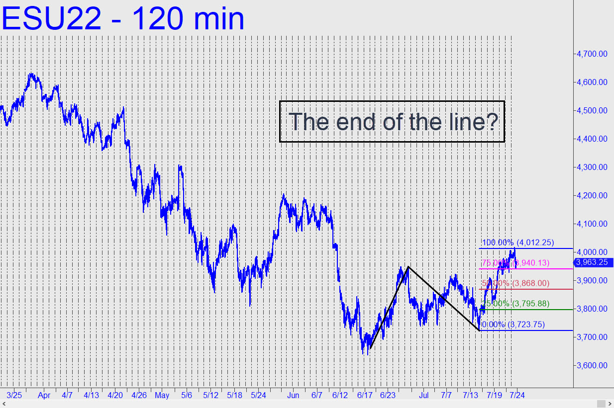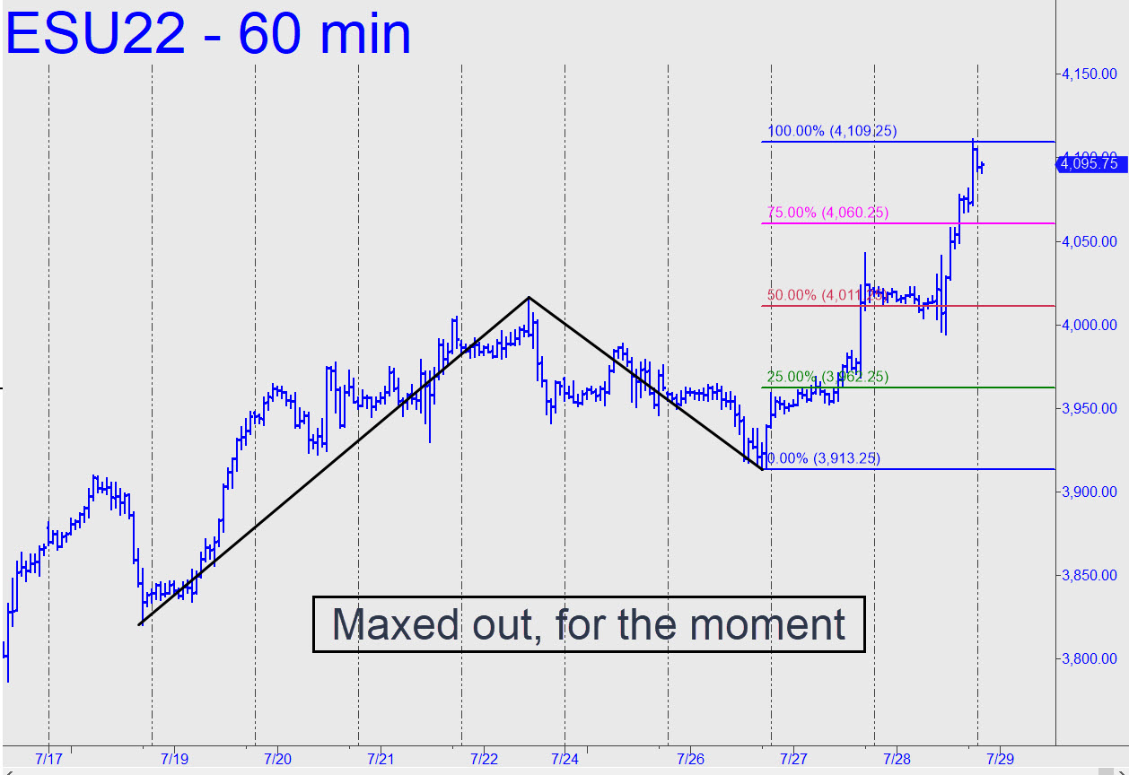 The futures reached the end of the line Friday at the 4012.25 Hidden Pivot target of a bear rally pattern begun five weeks ago from 3960. Is that it? We’ll let impending price action answer that question, since there is always the possibility that buyers will blow past D in a trice when the new week begins. That would put them on a course to test the resistance of a series of downtrending peaks recorded in early June. There are still outstanding targets at 4033 and 4116, plus a ‘soft’, best-case target at 4256. I haven’t made this tactic official, but you can use the HP levels of the spent pattern shown in the chart experimentally for ‘mechanical’ trades. ______ UPDATE (Jul 26, 6:43 p.m.): Index futures have lunaticked sharply higher in after-hours trading, presumably because both Microsoft and Google released dreadful earnings news. This is how DaBoyz punish bears for guessing right: by pulling their offers in a zero-volume environment so that stocks can zoom gratuitously. This will also give the news media a chance to come up with a dozen wrong reasons why stocks have rallied on bad news. How far will they get? Not very, would be my guess. ______ UPDATE (Jul 27, 7:26 p.m.): Finally, the short squeeze we all knew had to happen before the Mother of All Bear Markets can resume in earnest! On nearly universally anticipated “news” from the Fed, the futures blew past the 4033 target with enough force to be presumed headed to at least 4116.75, the next Hidden Pivot target in the sequence provided above. Here’s a smaller pattern that can be traded ‘mechanically’ on the way up, with a 4095.25 ‘D’ target that looks absolutely certain to be achieved. _______ UPDATE (Jul 28, 3:13 p.m.): I’ve raised the target to 4109.25, since in this case the ‘marquee’ low at 3820.25 was too distinctive to ignore. Here’s the chart. _______ UPDATE (Jul 28, 8:17 p.m.): On crap earnings for AMZN released after the close, DaBoyz repeated their nasty bear-squeeze trick from a day earlier, when they goosed MSFT and GOOG on similarly bad news. The result is a peak that overshot my 4109.25 target (see above) by a hair. Here’s the chart. The pullback so far could have been worth as much as $3,200 on four contracts. If you shorted the target, cover half (two) of your contracts now; place an order to cover a third contract at 4078.25, and use an impulsive stop-loss on the 15-minute chart for the last. Until such time as 4078.25 is hit, your remaining contracts should be worked o-c-o with a break-even stop-loss.