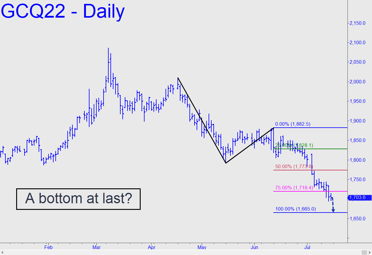 Finally, a bottom in sight? Judging from the chart, with its textbook rhythms and clarity, it will be hard for the August futures to avoid reaching D=1665.00 and then bouncing tradeably from this Hidden Pivot support. The downtrend has obliterated several minor supports where I’d suggested bottom-fishing, but also a major one at 1773.80, the midpoint of the C-D leg. This suggested there was urgent selling still to come, and we will likely see the last of it within $1-$2 of the target. The pattern is too obvious for traders to count on a precise turn from D, but even an imprecise one should serve for bottom-fishing with risk tightly controlled. _______ UPDATE (Jul 21, 11:15 p.m.): The futures took a trampoline bounce after swooning to 1678, but I am not ruling out the possibility of a relapse that gets closer to my 1665.00 target. Alternatively, a push exceeding 1744.30 would put bulls back in charge.