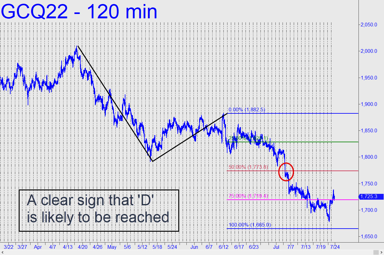 Although there’s a solid consensus in the chat room that a major bottom is in and that my 1665.00 target will not be reached, I have my doubts. They are based entirely on the decisive downside penetration of p=1773.80 on July 5. I have only very seldom seen ‘p’ obliterated in this way without giving way to a follow-through that hit ‘D’. If gold’s robust two-day rally is going to be an exception, the first evidence of this would come with an impulsive thrust exceeding three ‘external peaks that lie, respectively, at 1744, 1751 and 1771. That’s the kind of power rallies typically exhibit when ending bear markets. If this one can vault all three peaks with no visually significant pullbacks along the way, I’d infer it is the real deal — at long last. (July 27 note: For the December contract, the three peaks lie at, respectively, 1763.70, 1770.80 and 1785.80.)