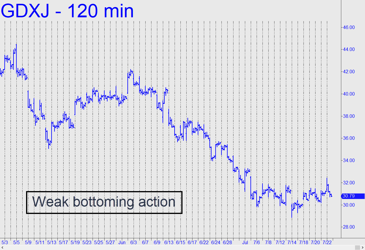 If gold is bottoming, the evidence has been somewhat more persuasive on the Comex than in ETFs reflecting growth prospects for miners and junior exploration companies. This ETF generated a weak impulse leg last week that was doubtless sufficient to pique the interest of weary bulls. but the next thrust would need to impulse above the 33.27 peak recorded on July 1 to be worthy of notice. The move would be more persuasive if there is no discernible B-C pullback once GDXJ has surpassed Friday’s dubious high at 32.29, which was achieved on the opening bar with a short-squeeze that would have trapped and soured more than a few bulls.