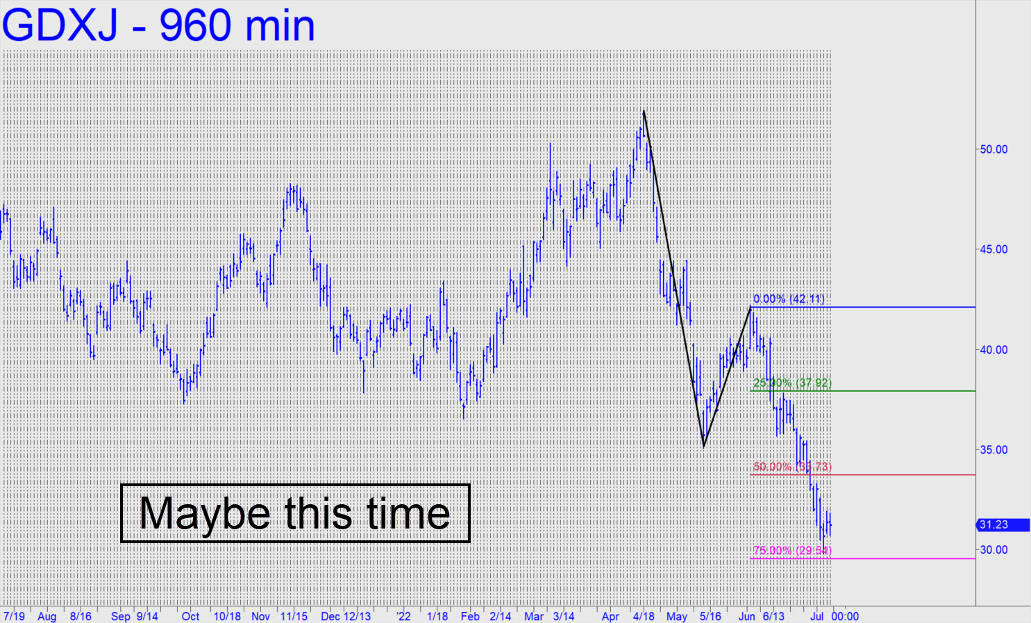 A 29.92 downside target I’d drum-rolled, albeit with a dollop of sarcasm, turned out to have been just the ticket for subscribers who have been waiting patiently for a turn. Enough of you reported getting long using my number that I’ve established a 400-share (or multiple thereof) tracking position. Assuming 50% of the position was exited near 31.35 as advised, you are holding half of the original position with a profit-adjusted cost basis of 28.49. For now, stick to the 30.52 stop-loss advised earlier. That’s where selling would generate a bearish impulse leg on the lesser charts. Make the order o-c-o with another to exit an additional 25% of the position at 32.43. ______ UPDATE (Jul 12, 5:25 p.m.): If you followed my guidance, you should have dismounted this glue horse at 30.52 for a theoretical gain of $206. We’ll go back to ignoring GDXJ until such time as it shows better behavior. Worst case is now D=25.35. yet one more place where we could back up the truck and hope to make money even if we’re wrong about a bottom there.