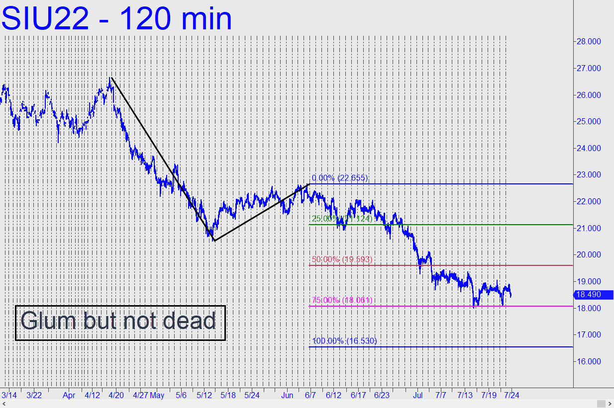 Silver showed none of gold’s feistiness last week, but that doesn’t mean it won’t follow gold higher if bullion quotes are about to embark on a sustained rally. Silver’s relative strength would presumably increase as a bull market pushes toward adolescence, shrinking the gold silver ratio from a current 93 to a more silver-friendly level below 50. For now, though, we can infer that September Silver’s reluctance to punch below p2=18.06 reflects consolidation, not distribution. The 16.53 downside target will remain valid in theory nonetheless, until such time as the C=22.65 high of the bear-market pattern is exceeded. However, it’s not yet possible for me to say with high confidence whether it eventually will be achieved.