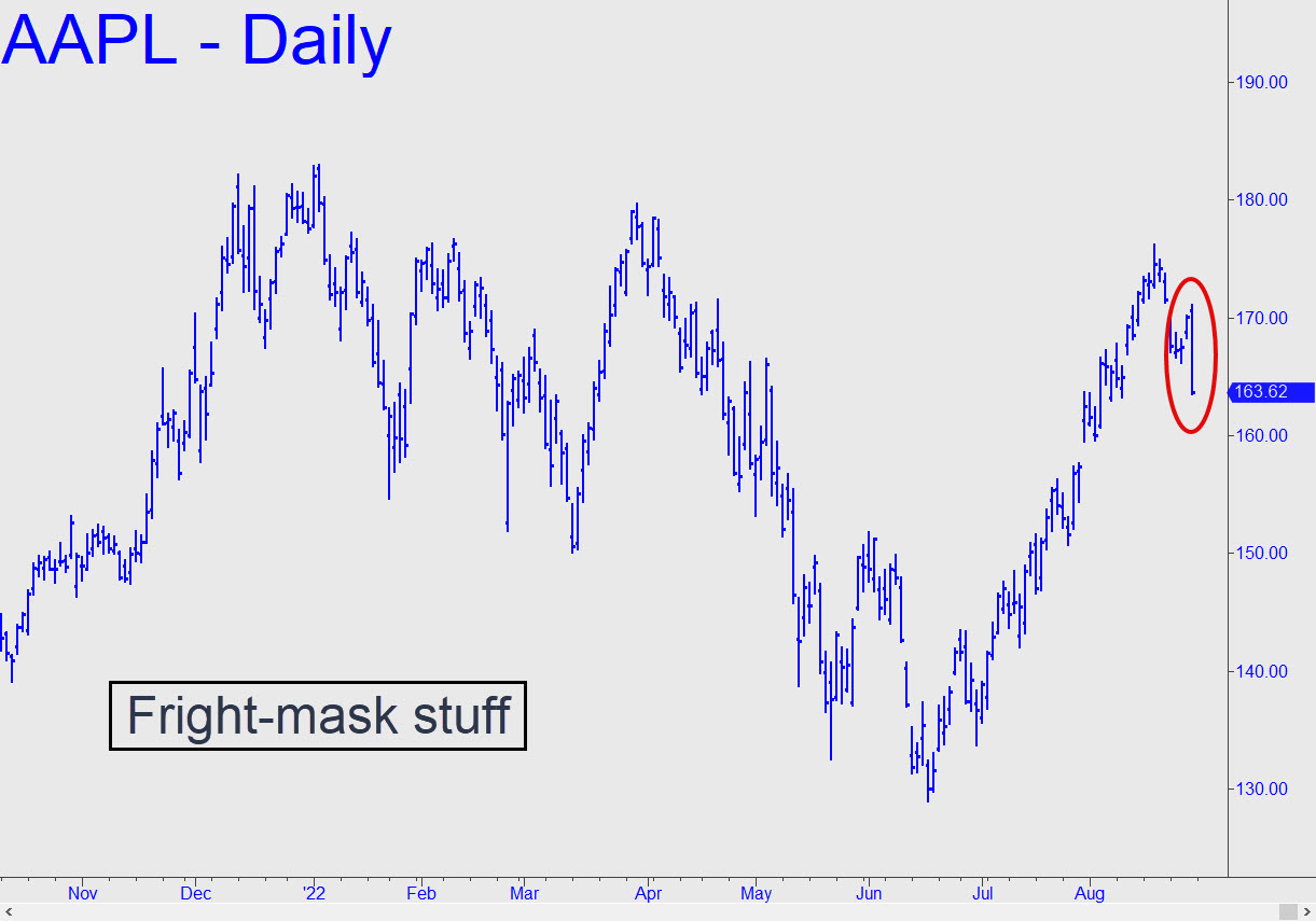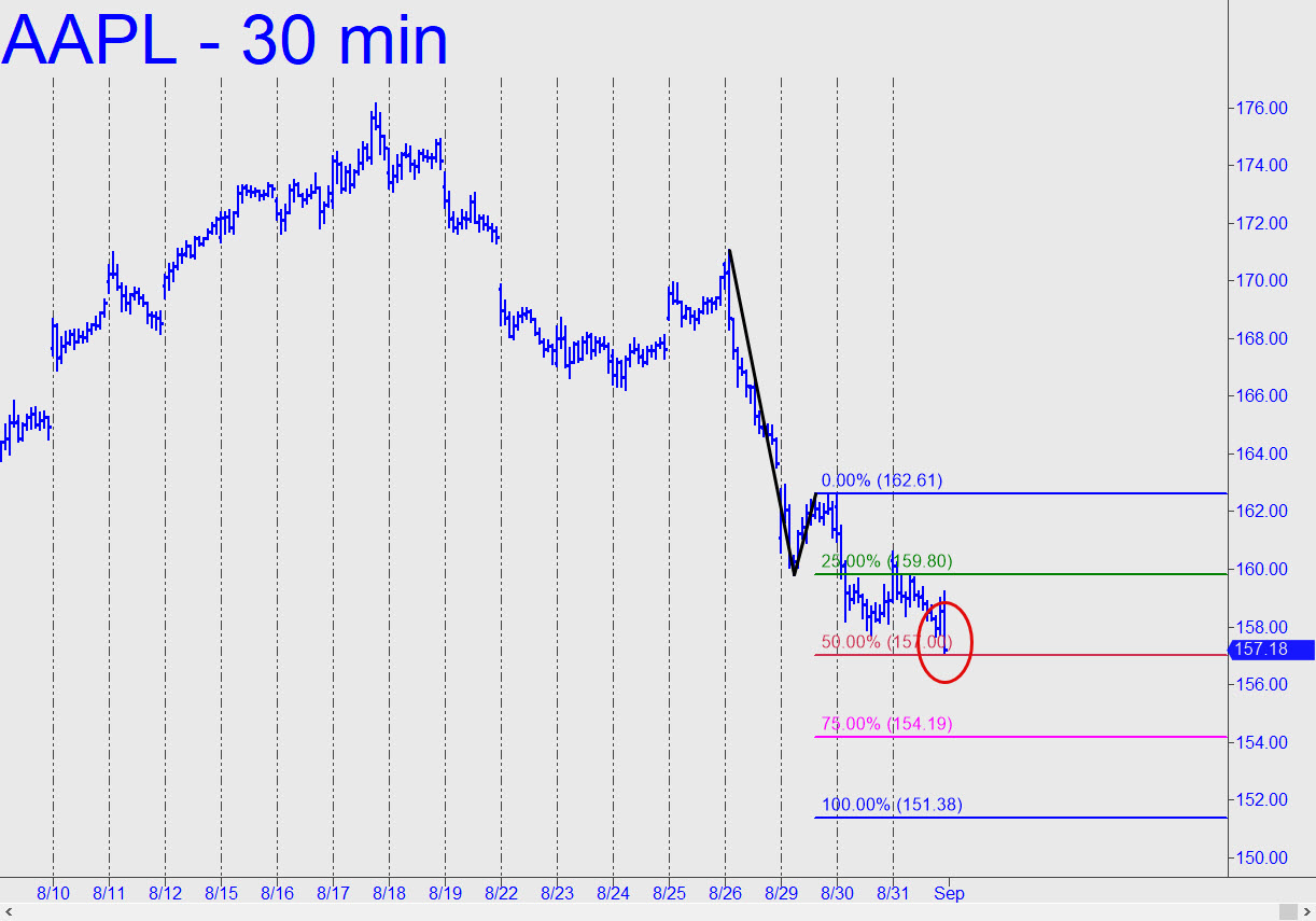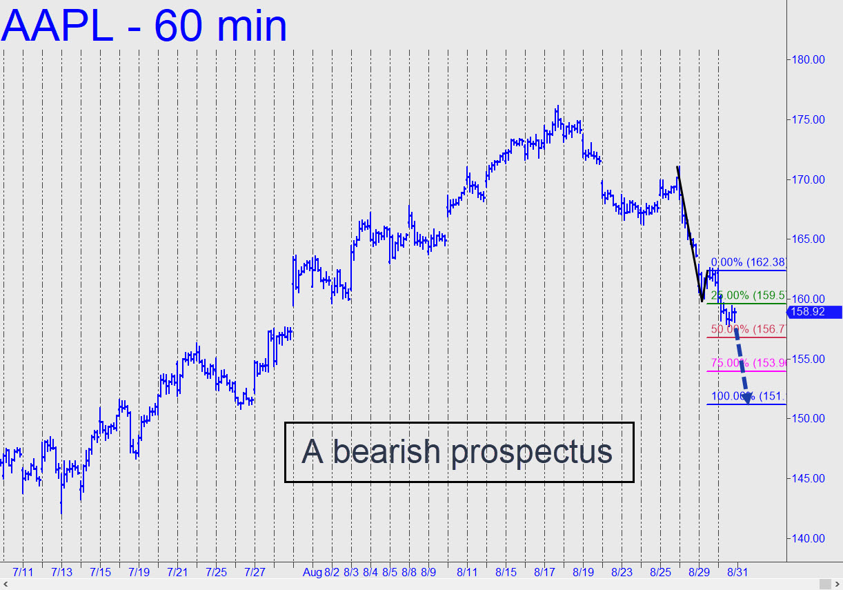 AAPL was overdue for a drubbing, especially since the stock could not have continued to hover in outer space when the broad averages finally got hit. Nor is there any compelling reason for the portfolio chimps who live off AAPL to put much effort into holding it aloft while other stocks continue to correct. You can see that a seemingly nasty fall to $150 would not change the menancingly bullish look of the chart or the likelihood of new record highs. Most immediately, there’s a 162.40 downside target we can use as a minimum projection over the near term (30-min, A=174.90 on 8/18). ________ UPDATE (Aug 30, 5:06 p.m.): The bearish pattern shown in this chart, with a 151,15 downside target, is all we’ve got to work with at the moment, The impulse leg is not legitimate and the C-D leg has yet to touch p, but we’ll give the pattern the benefit of the doubt as AAPL continues to make its way lower. Apple says iPhone sales are holding up fairly well, but with Europe headed into a possible economic depression, the market for overpriced/over-featured cell phones is about to crash along with consumer spending. ________ UPDATE (Aug 31, 11:40 p.m.): This chart revises the quite bearish target slightly upward to 151.38. Today’s low just pennies from p=157.00 says the pattern is working and will yield good odds for trading its levels ‘mechanically’. ________ UPDATE (Sep 3, 10:32 a.m.): ‘Good odds’, indeed! A straight-up ‘mechanical’ short at the green line would have produced an intraday profit of as much as $486 per round lot. The 151.38 target remains viable as a minimum downside objective for the near term. ______ UPDATE (Sep 7, 9:30 p.m.): My newly bullish outlook for the E-Mini S&Ps contrasts sharply with a still-bearish forecast for AAPL. I’ll be interested to see how this divergence is reconciled, but for now we should let each vehicle speak for itself. AAPL would get in bullish gear if it pops to 160.59. _______ UPDATE (Sep 8, 10:30 p.m.): And now it would take merely a print at 157.10, a tick above Tuesday’s ‘external’ peak, to generate a bullish impulse leg on the hour chart. That, presumably, would put AAPL at least temporarily in gear with index futures that have turned robustly bullish.