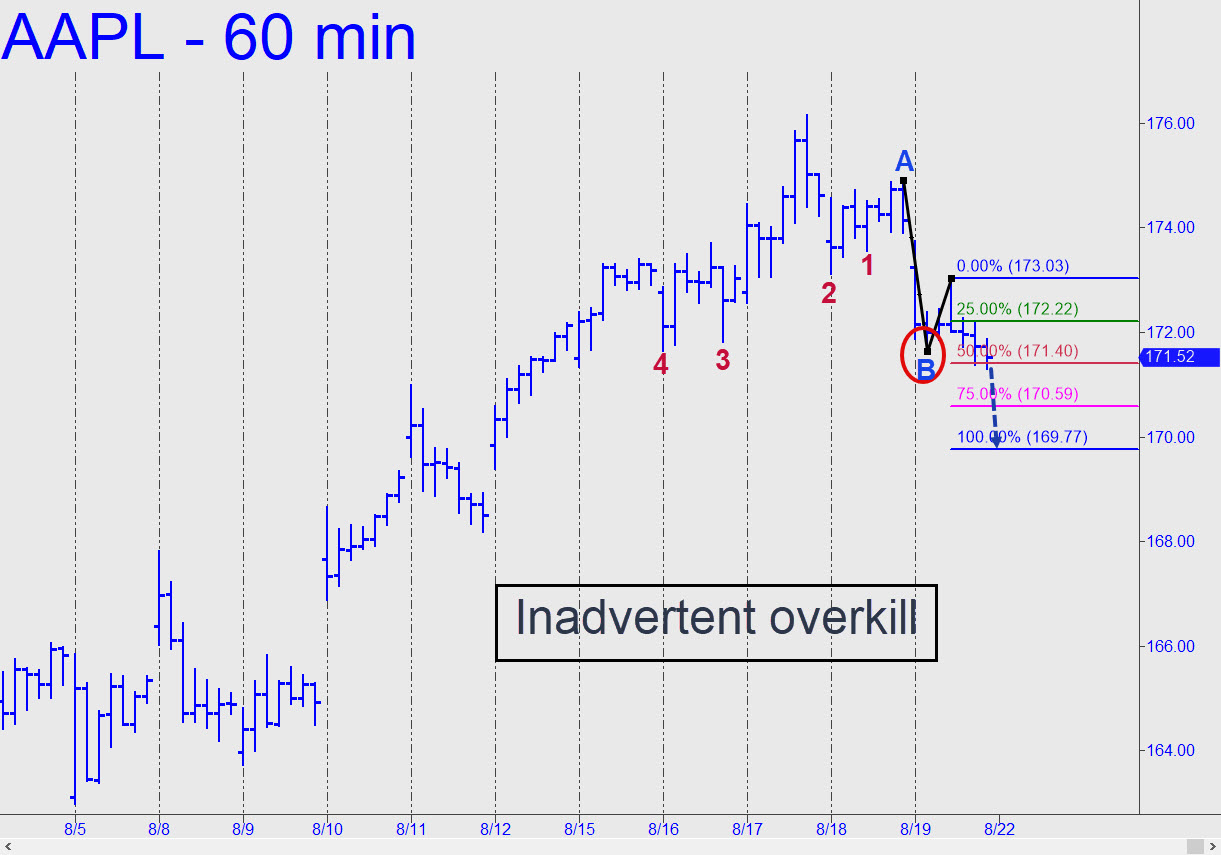 DaBoyz must have meant to perform the same sleazy trick they do two or three times a week, particularly on Fridays, letting AAPL fall on the opening to exhaust supply for a planned short squeeze. However, they evidently misjudged sellers’ eagerness and wound up creating a quite robust impulse leg that surpassed no fewer than four prior lows, two of them ‘external’. This implies the decline will continue to at least D=169.77 or perhaps lower for a more significant correction. AAPL lost Friday’s mild tug of war with indexes that had wanted to fall harder, but now they can and probably will. The pattern looks ripe for ‘mechanical’ shorting, most favorably on a bounce to the green line, however unlikely. either Sunday night or in the early going on Monday.