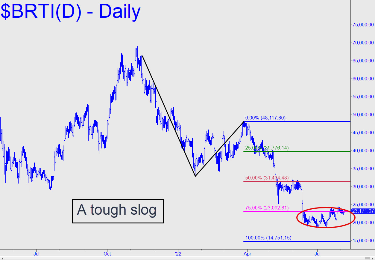 It’s been a particularly tough slog for Bertie these last couple of months. Those who have been praying for a big short squeeze to lighten their losses are many. Quite a few were trapped at much higher prices, including some of the biggest crypto bettors in the world. Prayerful losers constitute heavy layers of supply that didn’t exist in bitcoin’s early days. Supply is particularly daunting along the final few, crushing bars of bitcoin’s collapse last spring. Two months of heavy lifting since then have succeeded in hoisting this vehicle only to the midpoint of the last bar (see inset), which saw BRTI free-fall from $32k to below $19k. If and when it rises to the 25,634 low from the swift and devastating down-leg ended in mid-May, buyers may begin to feel like Sisyphus as they shoulder into it for an indefinite period. Why bitcoin should have any value at all was always a fair question. But $69,000 per copy? I asked this question of many experts, some who’d made fortunes on the way up, but I never got a good answer. It came out of nowhere and is not money by any stretch of the imagination, just a secure means of recording transactions.