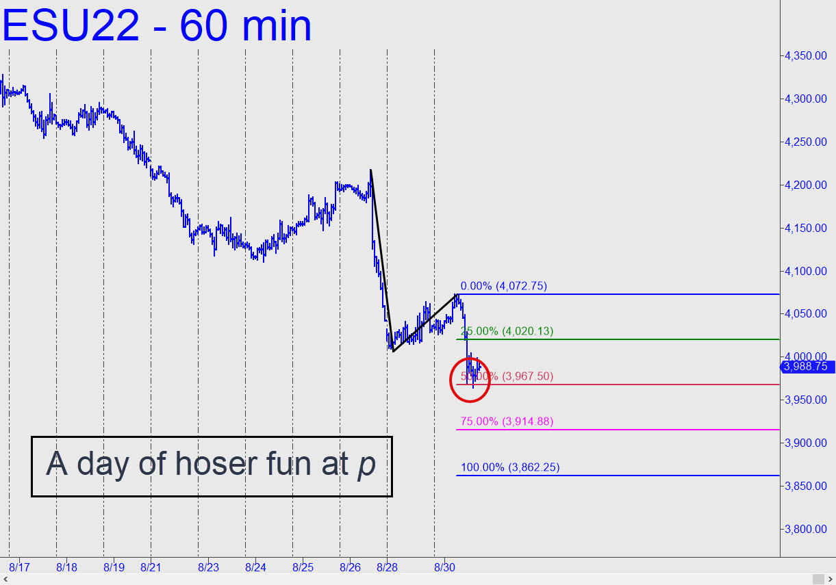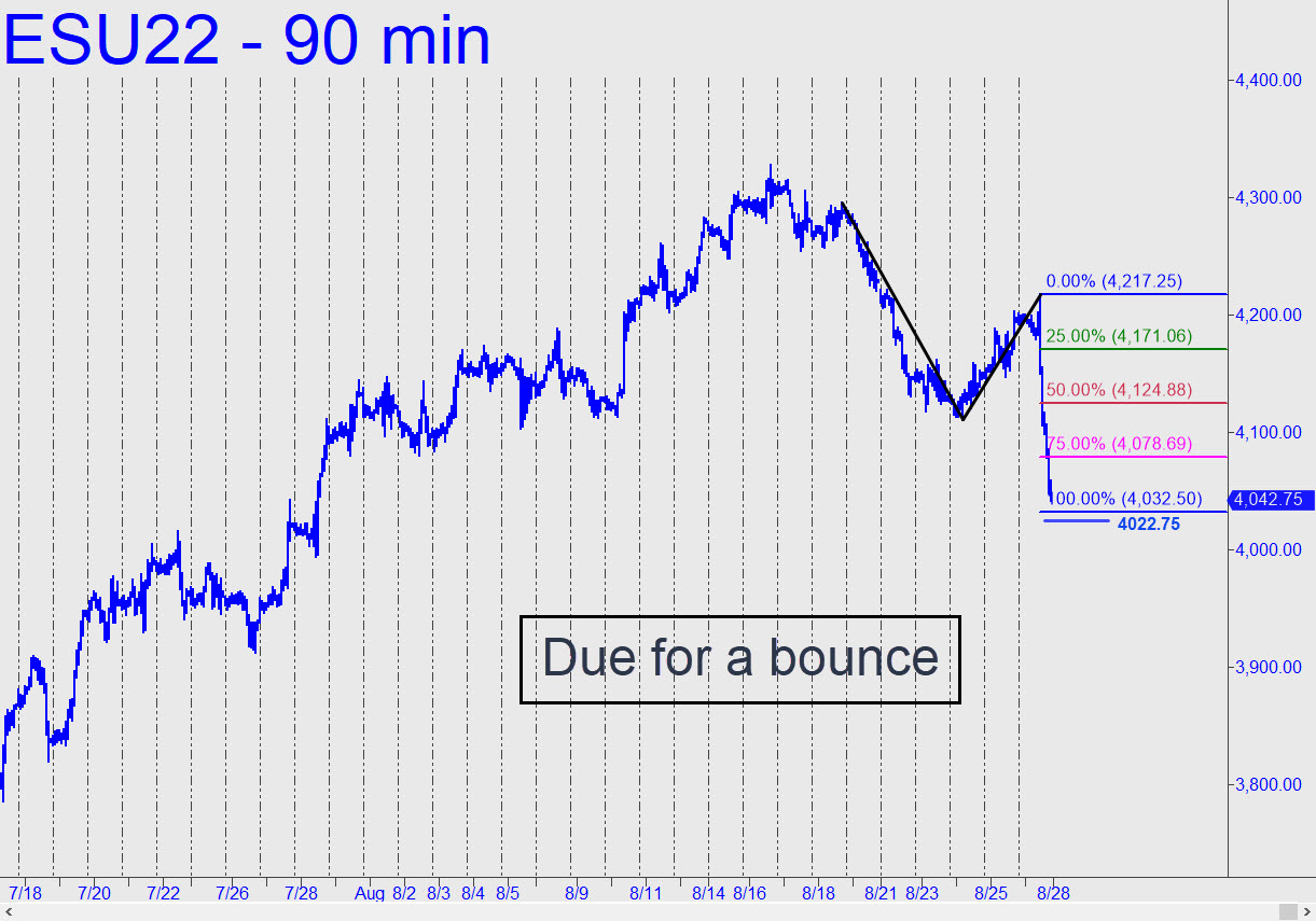 The futures were freefalling to the 4032.50 target shown when the closing bell left them a split-hair shy of it. Look for a tradeable turn from the pivot, although not necessarily an enduring one. Sliding point ‘A’ a step higher yields a slightly lower target at 4022.75 that might also work for bottom-fishing. As always, a decisive move through either of these ‘hidden’ supports on first contact would suggest the trend is likely to persist, even if there’s an intervening bounce. The selloff damaged the intraday charts, but because it was tied ostensibly to news, there is no reason to think it will continue for much longer. ________ UPDATE (Aug 30, 4:45 p.m.): Sellers spent the entire day frolicking at p=3967.50 of this pattern, with a 3862.25 downside target. They’ll need to crack p to drive this brick lower, but the pattern should continue to work unless stopped out above C. _______ UPDATE (Sep 1, 11:15 p.m. ET): One subscriber reported shorting this brick at 3967.50, per my 10:34 chat room instruction. The 4001.75 stop-loss advised implies entry risk of $6800 on four contracts, but you’ll be on your own in any event. ________ UPDATE (Sep 2, 9:04 a.m.): The trade was stopped out by a lunatic leap ahead of the bell to 4002.00. Cool trick, wasn’t it?