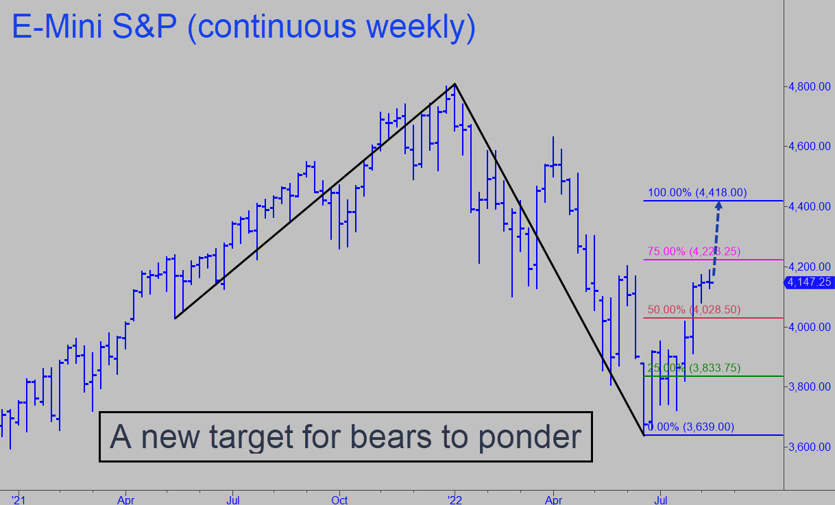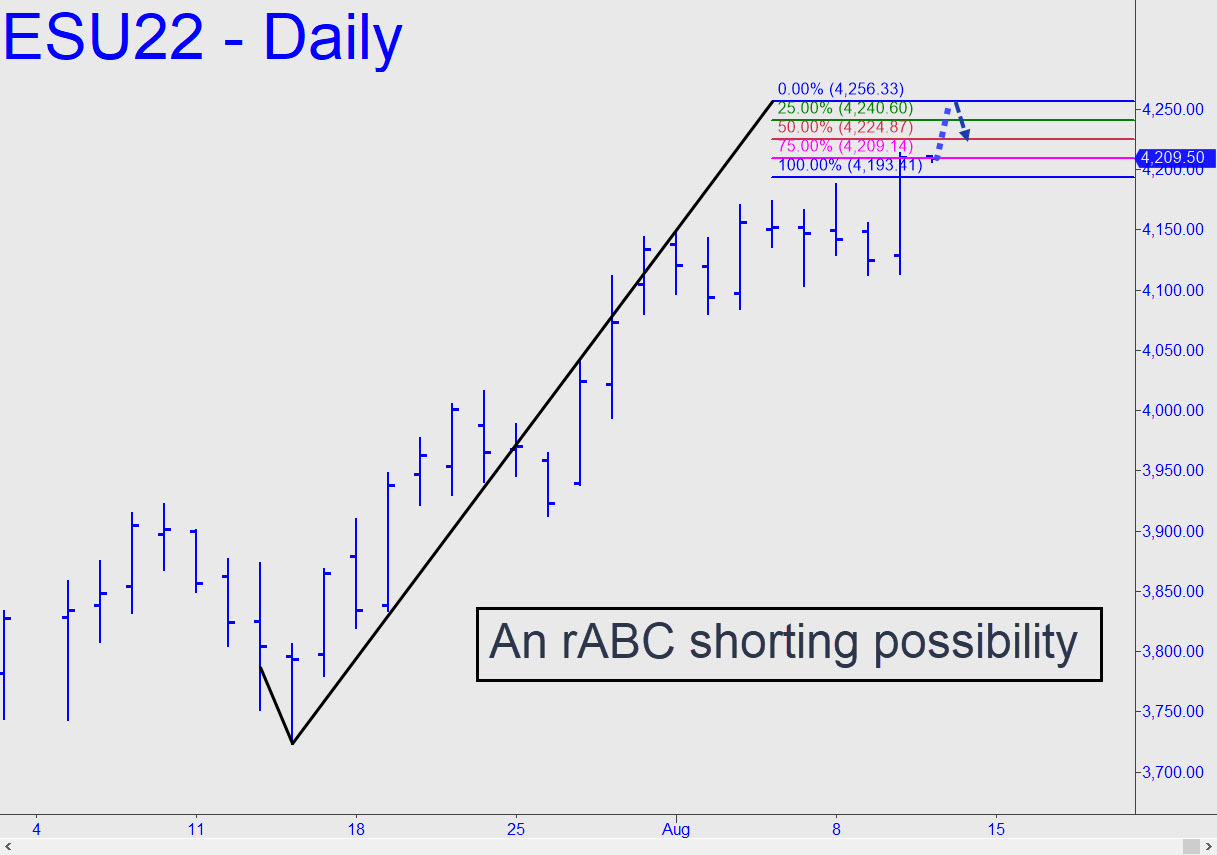 A shelf of resistance created back in June looks primed for a challenge. Short-covering bears have been the sole driver of this presumably doomed rally, now entering its ninth week. Much of it has occurred into airless gaps, with economic ‘news’ as the catalyst, and thin, off-hours markets offering almost no resistance. A push past early June’s thicket of supply looks all but certain, since the approach path has been a methodical, ratcheting process of stair-building that has consumed nearly two weeks. Once above the resistance, it’s anyone guess how far DaBoyz will be able to take this hoax. I’m going to drop a ‘c’ anchor for a reverse-pattern short near 4256, not because it’s a Hidden Pivot, but because it is in the middle of the ocean, so to speak, where bulls, bears and even chartists will be at their queasiest. ______ UPDATE (Aug 8, 11:21 p.m. ET): Dave Isham posted this pattern in the chat room today, with a bear-rally target that pessimists should keep well in mind. The D target at 4418.00 is 26.25 points higher than his, since I used a slightly different point ‘A’ low. In either case. the midpoint resistance got shredded so badly that ‘D’ should be regarded as an odds-on bet if the futures get past the middle-of-the-ocean number at 4256 noted above. _______ UPDATE (Aug 10, 7:54 p.m.): To get short, use this rABC pattern, anchoring the ‘C’ high in the range 4254.90 – 4257.70, with an implied trigger 15.73 points off a high falling within those numbers. If you get a chance to cover half 15.73 points below the price where the trade was initiated, you’ll be on your own. Please note that theoretical entry risk is about $800 per contract and that it is sufficiently cutting-edge to be labeled experimental. Spectate if you wish.
