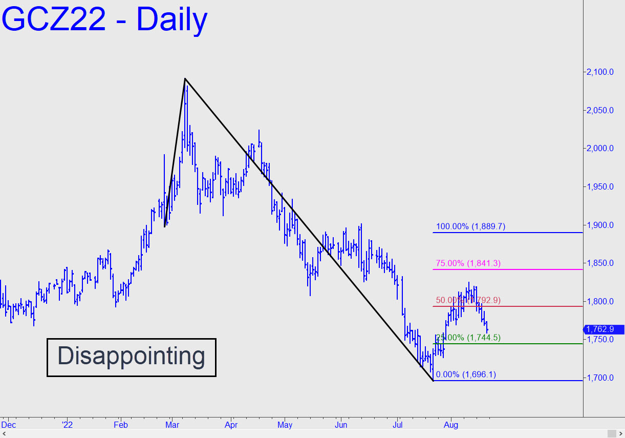 I’ve scaled back my pattern and rally target to reflect gold’s disppointing performance over the last two weeks, The impulse leg was a dubious qualifier to begin with, and the follow-through leg couldn’t even reach p2=1841.30, let alone re-energize itself with a push above an ‘external’ peak. That said, the pattern could still generate a so-so ‘mechanical’ buy at x=1744.60 for a one-level ride to p=1792.90. If you elect the trade, just be sure to use a ‘camouflage’ set-up on a small-degree chart to cut the nearly $10,000 of implied entry risk on four contratcs down to more like $800. The 1889.70 target is a longshot at this point, never mind the 1985.40 target of the larger ‘reverse’ pattern shown here earlier.