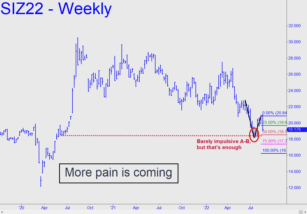More pain is coming, since the July 15 low at 18.17 generated the first impulse leg we’ve seen on the weekly chart since this interminable correction began exactly a year ago. The low breached the distant, look-to-the-left external from last June by only a hair, but that’s enough to allow the presumption that the C-D follow-through leg will have its way. It should reach p=18.53 at least, a midpoint Hidden Pivot that can be bottom-fished with the usual precautions. But if the support gets splattered, look for more downside to p2=17.37, or even D=16.22 in the Sep-Oct period.