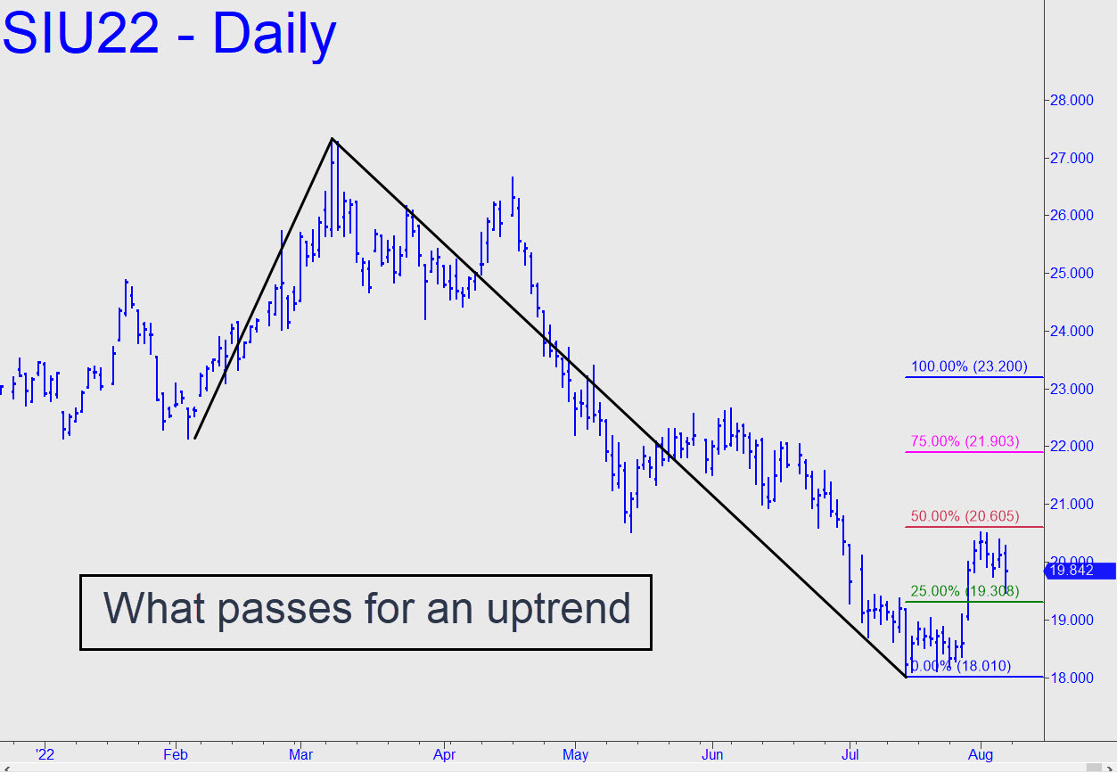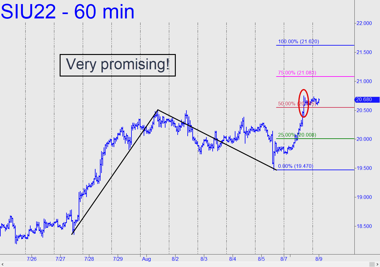 Silver has performed somewhat better than gold recently, but that’s not saying much. Since the September contract didn’t quite reach the red line last week, I cannot recommend a ‘mechanical’ buy if it touches the green line on Monday. My gut feeling is that the trade would make money, but there’s no compelling reason to cast discipline aside. There’s a potential gain of around $6400 per contract on a one-level move to p=20.60. however, so don’t feel constrained from trying if you know how to keep theoretical risk down to $400 or less by applying ‘camouflage’ on the five-minute chart. ______ UPDATE (Aug 8, 11:35 p.m.) With an easy pop through p=20.54 today, and then a relaxed consolidation above it, September Silver looked terrific. If it closes higher on Tuesday, that would strongly imply the rally is destined for a minimum 21.62, the D target shown here. _______ UPDATE (Aug 11, 5:10 p.m.): A drop to x=20.00 would trigger an attractive ‘mechanical’ buy, stop 19.46. With about $2600 of initial risk per contract, the trade is recommended only to those familiar with ‘camo’ set-ups who can pare the theoretical risk down to $200 or so,
