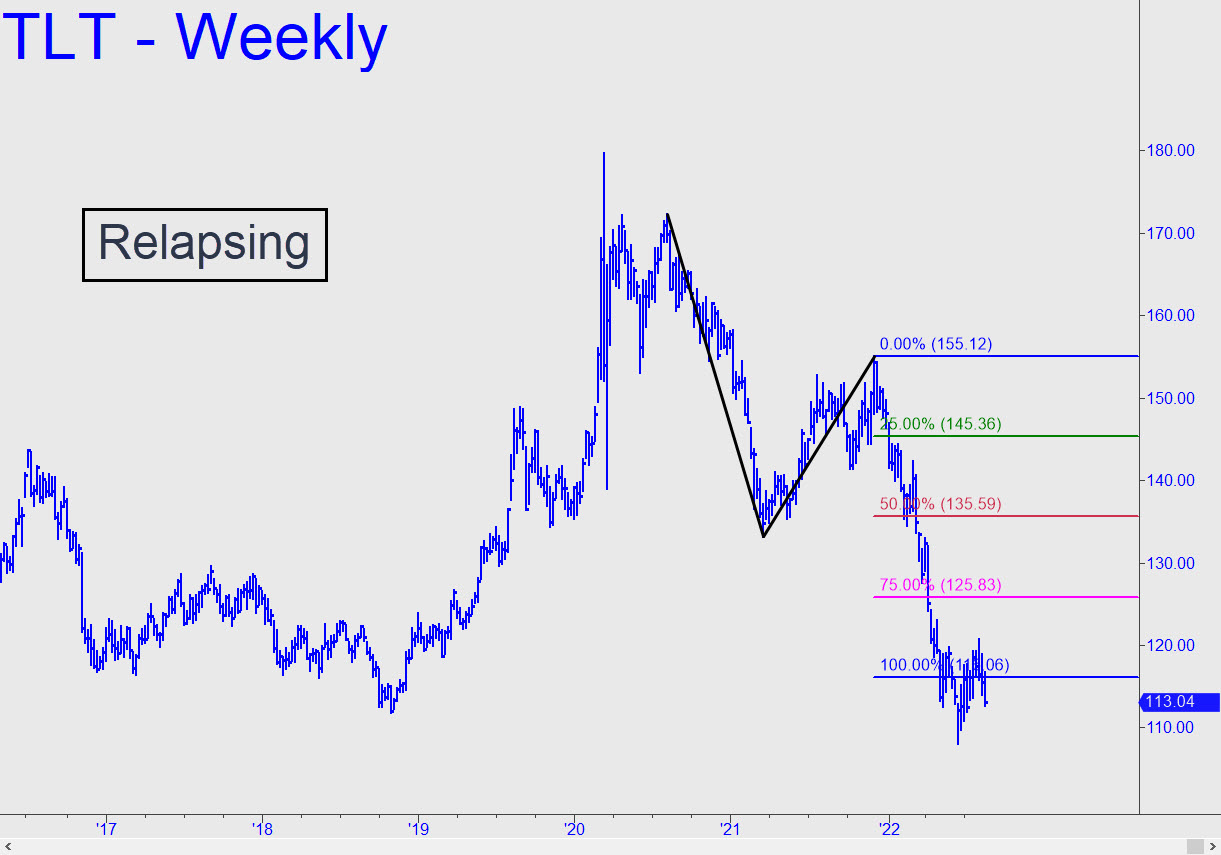 There is too much angst in the weekly chart, including the May/June destruction of big D=116.06, to offer much hope that the long-dated bond’s two-year agony is about to end. For now, I will allow but two bullish possibilities: 1) a bounce from the 109.07 ‘d’ target of this reverse pattern. It’s more than a slim reed, however, and therefore worth bottom-fishing, but don’t count too heavily on a major reversal; and then there is below it 2) a ‘voodoo’ number at 106.54 that could could also provide a tradeable bounce off a ‘reverse’ pattern with a ‘c’ low anchored at that price.