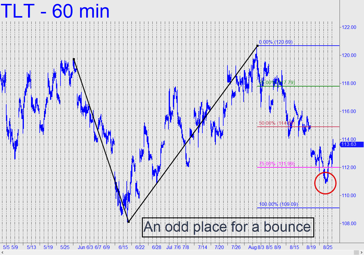 The pattern we’ve been using for several weeks, with a still unmet 109.09 downside target, is clear and compelling, implying that this sharp bounce from well north of it is not destined for greatness. Even so, we’ll give the rally the benefit of the doubt, especially if it should continue on up to 116.75, where a distinctive ‘external’ peak made two weeks ago on the way down cries out to be tested. Please note that a print at p=114.89 would trigger a so-so ‘mechanical’ short, stop 116.82, and that if the trde were to get stopped out, TLT would have an even-odds chance of breaking out above C=120.69 of the bearish pattern. _______ UPDATE (Sep 1, 11:10 p.m. EDT): TLT has bounced tentatively from within a hair of the 109.09 target, so there’s a good chance the rally could get legs. _______ UPDATE (Sep 7, 12:20 a.m.): The way sellers have crushed a 109.09 ‘hidden’ support with barely a bounce suggests TLT is headed significantly lower. A test of 100 seems almost too obvious to consider, but I’ll have a closer look as soon as I am able to access Tradestation.