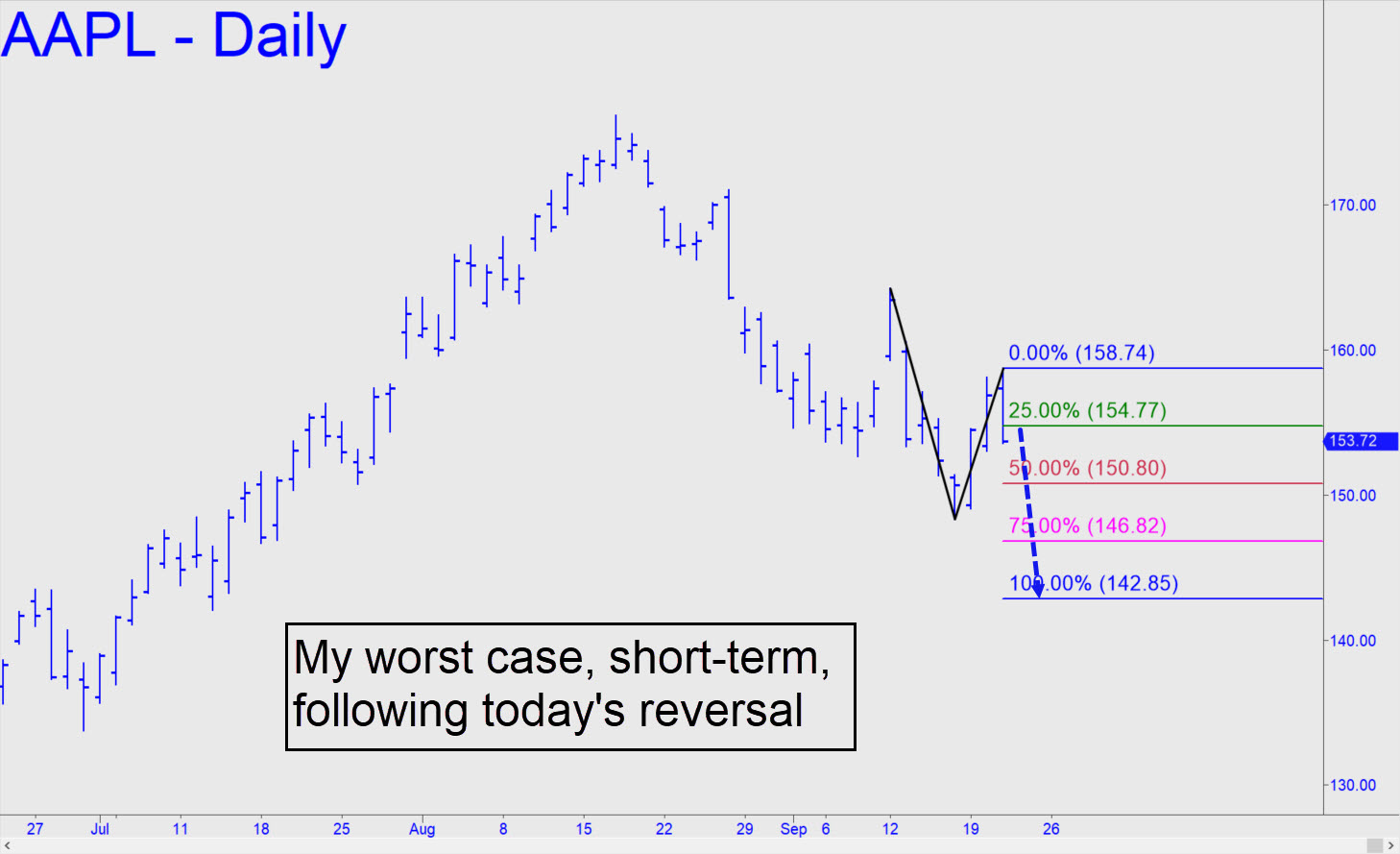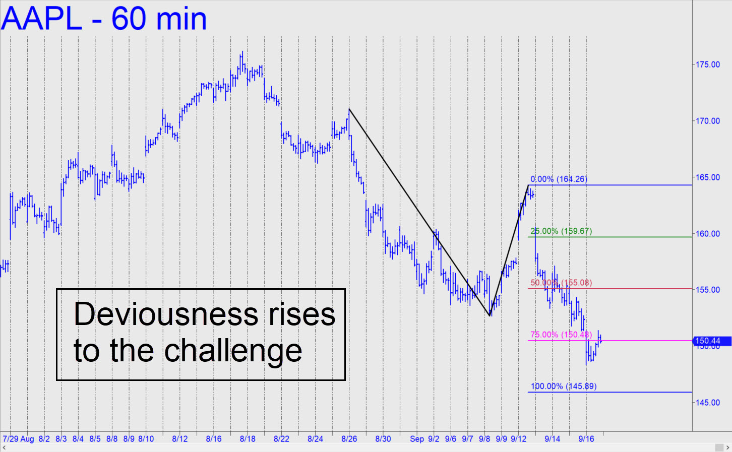 When AAPL hits 145.89, that will represent a 17% fall from mid-August’s peak, which, amazingly, came within less than 4% of achieving new record highs (!) My hunch is that the stock’s institutional sponsors want the stock to fall by at least 20%-30% before they start accumulating seriously again. Realize that their goal is no longer to push AAPL to new all-time highs, since that is probably impossible, but rather to buy it cheaply enough, and with sellers sufficiently depleted, to guarantee a profit on whatever short-squeeze rallies they can trigger off. Count on them to do this repeatedly as the Mother of All Bear Markets works its way to the bottom of the Marianas Trench over the next 2-3 years. ______ UPDATE (Sep 19, 8:10 p.m.): Today’s short-squeeze was rigged in the usual way: Pull all bids ahead of the opening bell, exhausting sellers. This ploy almost never fails, and today it produced a bullish impulse leg on the hourly chart. I don’t expect the rally to get very far, but we’ll need to respect the fledgling uptrend nonetheless with a cautiously bullish trading bias. ______ UPDATE (Sep 21, 12:24 p.m.): I should have mentioned this in the previous update, but the stock looks bound for a top either at 159.38 (A=148.71 on 8/19 at 7:00 a.m.); or at 161.00, a ‘voodoo’ number. Here’s the chart. Notice that I used an after-hours bar for the ‘A’ low. I did so because it is such a distinctive one-off bar. _______ UPDATE (Sep 21, 7:42 p.m.): Even at the apex of today’s nuttiness, AAPL didn’t quite make it to the 159.38 target. Now I doubt that it will, at least over the near term. Another factor working against bulls is that the stock’s canny handlers had two full days to distribute shares. Look for more downside on Thursday to at least p=150.80, with D=142.85 as my worst case in the days ahead. Here’s the chart. _______ UPDATE (Sep 22, 11:55 p.m.): The 150.80 target billboarded in my last update caught the low of a nearly $8 plunge within 11 cents. The subsequent $3.56 bounce could have been worth as much as $1400 to anyone who caught the bottom with four round lots. Since no one mentioned it, however, I did not establish a tracking position.