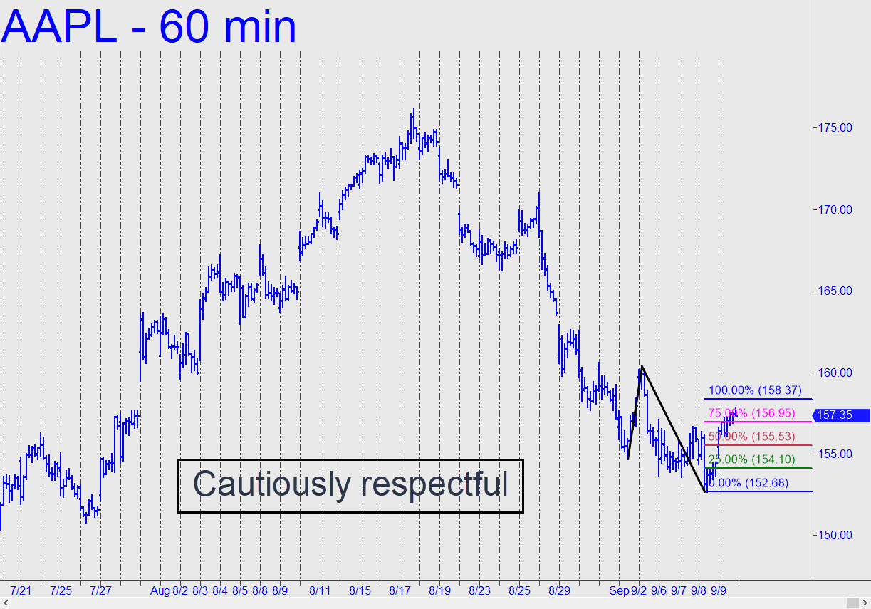 AAPL’s quasi-criminal handlers created a bullish impulse leg on the daily chart Friday in the usual way, with a short squeeze on a volume-less opening bar. We’ll respect the uptrend but trust it only as far as we could heave an anvil. In this case, that implies looking for a short-able top, or perhaps just a stall, at D=158.37 of the modest reverse pattern shown. If the stock pops above it there will be three opportunities for DaBoyz to increase the putative strength of the rally by exceeding each of the ‘external’ peaks nearby, the highest of them at 162.61 on August 29. ______ UPDATE (Sep 12, 10:51 p.m.): This is the steepest short-squeeze DaBoyz have managed since late July, and it has turned the hourly chat robustly impulsive. That implies it is not going to simply roll over and die, especially in answer to your prayers, and that any pullback must be regarded as corrective and therefore a buying opportunity. _______ UPDATE (Sep 13, 7:07 p.m.): Although AAPL might seem to have trashed my last update, that won’t inhibit me from attempting to bottom-fish with a tight reverse-pattern ‘C’ anchored at 151.74. In any case, I wouldn’t count out the scumballs who make their living by simply shaking this stock down and then running it back up on zero volume — just as they’ve done hundreds of times. ______ UPDATE (Sep 16, 12:31 a.m.): After plummeting in the early going, AAPL got its best bounce of the day off 151.78, four cents from the number drum-rolled above. No one mentioned doing the trade, so I didn’t track it. The subsequent relapse took the stock from 154.30 down to 151.58, and thence to 151.11 in after-hours trading. If AAPL continues to fall, use 148.58 as a minimum downside objective and a place to anchor a reverse-pattern ‘c’ to bottom-fish. _______ UPDATE (Sep 16, 8:42 a.m.): The stock is headed toward a tradeable bounce from 149.87, the target of a minor bearish pattern that came into focus overnight: https://bit.ly/3Dv5BZr (148.58 is a voodoo number that is still viable.) I don’t think the droolers and the algo monkeys are onto the higher number, and surely not the lower, and that’s why I like the trade(s), presumably rABC-style.