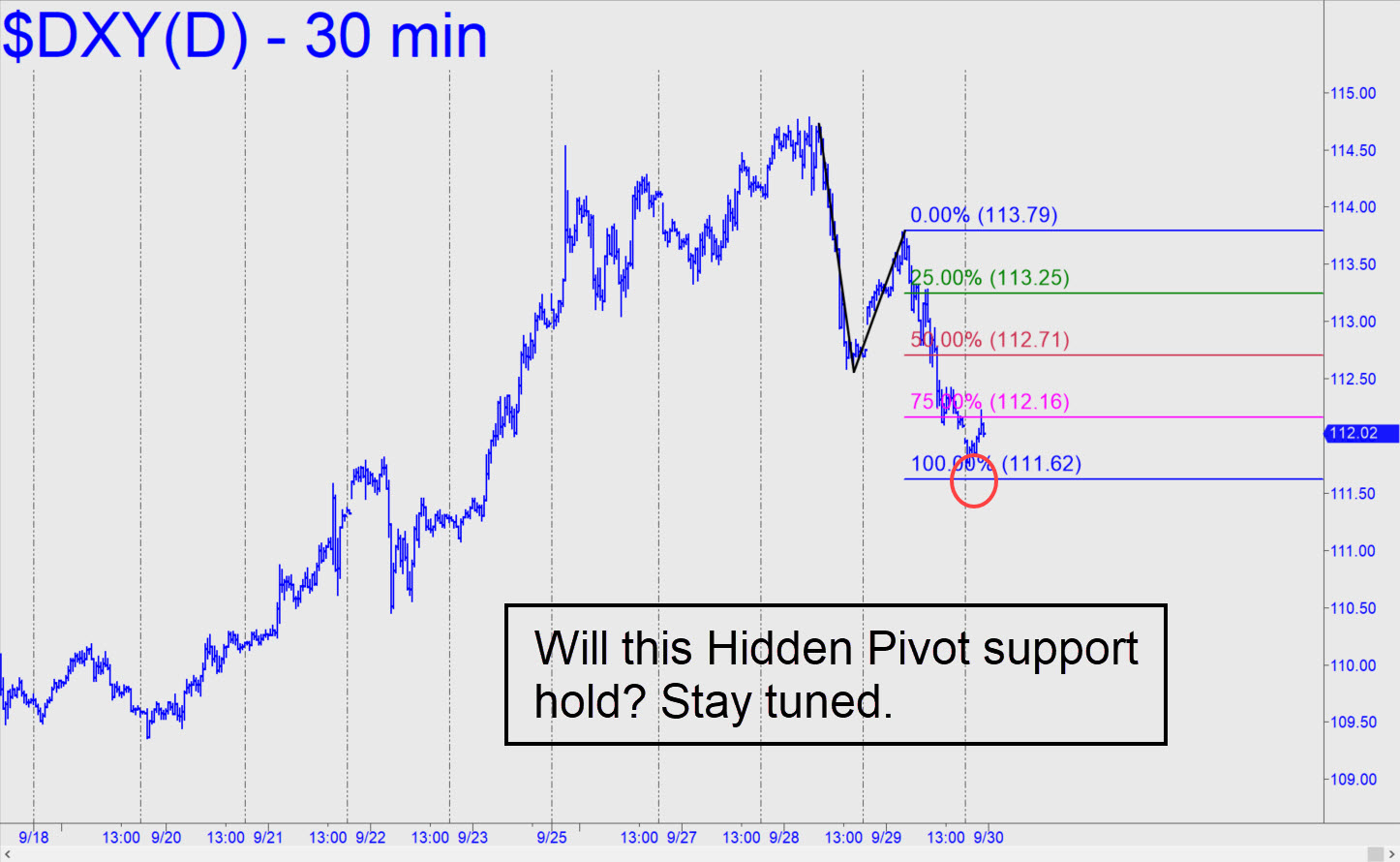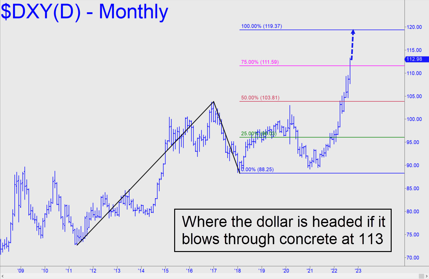 The Dollar Index peaked on Friday seven cents above a 113.16 target that has been on our radar for more than four years. The pattern took nearly a decade to play out, implying that any correction from these levels could last for quite a while — perhaps 12-18 months or even longer. The retracement presumably would set the stage for a renewed uptrend to the 119.37 target shown in this chart. Please note that although a severe correction down to the green line at 96.03 might be viewed by pundits as nothing less than the death of the dollar, it would in fact trigger an opportune ‘mechanical’ buy signal according to our trading rules. Because the dollar’s daily ups and downs have correlated inversely with nearly every trading vehicle we track, we might expect a resurgence in gold, stocks and T-Bonds, among other investibles, if the dollar is in fact headed into a prolonged decline. There’s also a chance it will power its way past the 113.16 target without a pause and just keep rising. That would suggest that the catastrophic deflation we’ve been predicting for many years is under way. A hardening dollar would tighten the screws on all who owe dollars, including debts arising from short-dollar positions in the $2 quadrillion derivatives market. _______ UPDATE (Sep 27, 5:11 p.m.): Amazing! DXY hasn’t quite shredded the granite Hidden Pivot at 113.16, but it does look like it’s trying to turn the resistance into support. This implies there is still plenty of unspent power pushing the dollar higher. If so, that would be very bad news for the economic world. ______ UPDATE (Sep 29, 11:28 p.m.): DXY has corrected sharply for the last two days after exceeding the target of a long-term pattern. If the retracement is going to be short-lived, the 111.62 Hidden Pivot support shown in this chart must hold. _____ UPDATE (Oct 4, 11:49 p.m.): The support mentioned above got crushed, presumably dooming DXY to purgatory for an indeterminate period.
