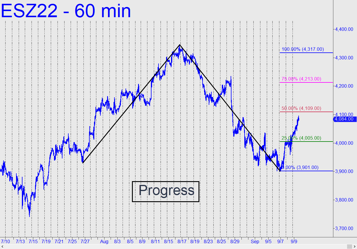 The 4109.00 target for the December futures (see inset) replaces one at 4090.63 that was tied to the expiring September contract. The target is a midpoint Hidden Pivot, and it can be used on Monday as a minimum upside objective. If it gets blown to smithereens — which seems likely, given the vicious short squeeze we saw on Friday — that would put D=4317.00 in play as no worse than an even bet to be reached. ‘Mechanical’ trades triggered on the hourly chart seem highly likely to work, given the power of the impulse leg and the no-nonsense look of the pattern itself. We won’t necessarily have to wait for a dramatic swoon, since small-chart ‘camouflage’ set-ups along the way can get us aboard practically at will with risk tightly controlled. Stay tuned to the chat room if interested.