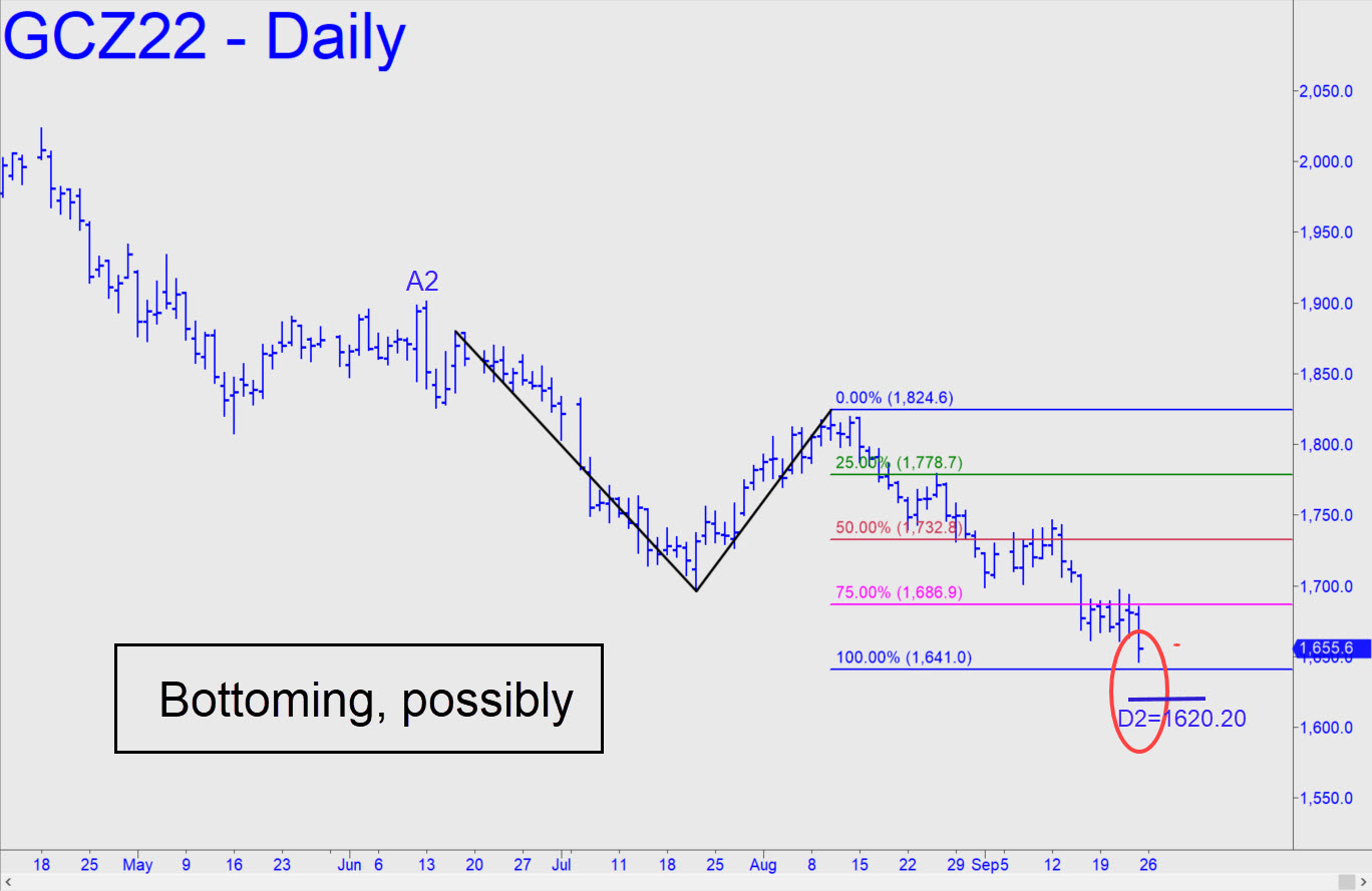 December Gold ended the week breaching, then closing beneath, a 1660.90 midpoint support associated with a ‘D’ target at 1497.20. Before we sink into despair, let’s use the lesser pattern shown in the inset to leverage a less severe outcome. The chart shows immediate downside potential to 1641.00, or to 1620.00 if any lower. Both are worth bottom-fishing provided you can set up the trade with initial risk of less than $150 or so per contract. There is also a possibility that Friday’s 1646.60 low will prove to be an important bottom, although I doubt it. A 1685.10 print by mid-week would change my mind, but let’s not hold our breath. _______ UPDATE (Sep 28, 8:17 a.m.): The gold trade I posted in the chat room last night canceled itself when the prospective ‘c’ anchor dropped more than a desirable few ticks beneath D=1628.70. The eventual low at 1622.20 was easily tradeable and came at 3:30 a.m. from this pattern, one that I should not have missed. I do not think sellers are done. Here is a quite bearish pattern with a 1597.50 target and a midpoint support that was breached last night. The pattern is gnarly enough that it should work well for any purpose, whether bottom-fishing or getting short ‘mechanically’.