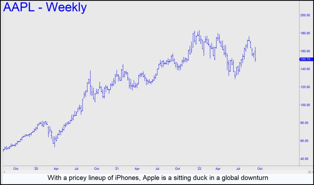 Which brings us to the bear rally in stocks. I’ve been looking anxiously over my shoulder, waiting for a crazy-loco short-squeeze to make investors forget we are so deeply in debt that only a full-blown depression can pay us up. Bankruptcies would accomplish this in relentless waves that will make us nostalgic for today’s rampaging consumer inflation. Wall Street chose AAPL to distract us from this grim reality, but the ruse failed. Employing subterfuge and relatively small sums of cash in ways that I described here in great detail, DaBoyz levitated the biggest-cap stock in the world to within 3.7% of new all-time highs. Unfortunately, they were unable to hold Leviathan aloft indefinitely until such time as the broad averages faked their way higher against the weight of a bear market.