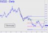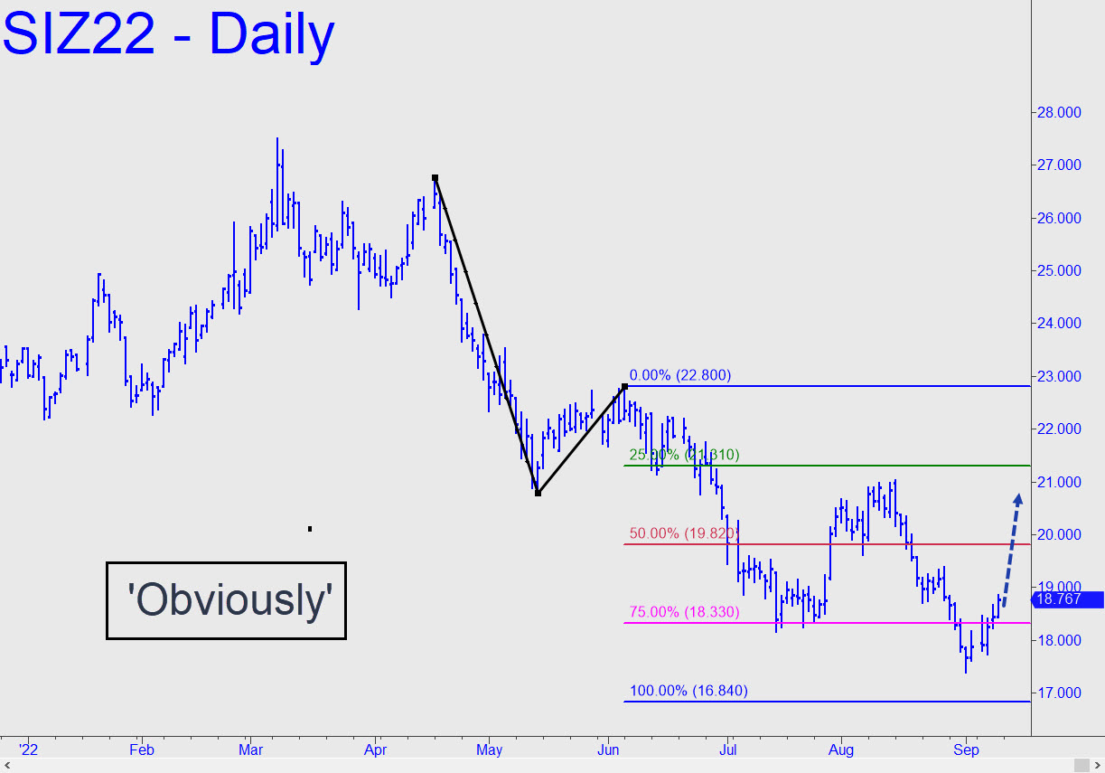 Rallies from midway between p2 and D in patterns as obvious as this one usually go further than we tend to imagine initially. Keep in mind, though, that if they reach the green line — in this case x=21.310 — that would trigger a ‘mechanical’ short with excellent odds of producing a profit. We’ll go with the flow in any case, which means that the 16.84o downside target will remain our minimum, short-term downside objective unless last week’s modest bounce exceeds the ‘external’ peak at 18.80 recorded August 16 on the way down. _____ UPDATE (Sep 12, 10:17 p.m.): Today’s lunatic leap has energized the bullish case while demoting the use of x=21.31 to get ‘short’ mechanically. I’m in wait-and-see mode, waiting for a sign of whether the rally is for real. ______ UPDATE (Sep 15, 4:19 p.m.): The ‘mechanical’ short is viable in theory, but I’m going to pass it up. A close above x=21.31 would hint that the really IS for real.