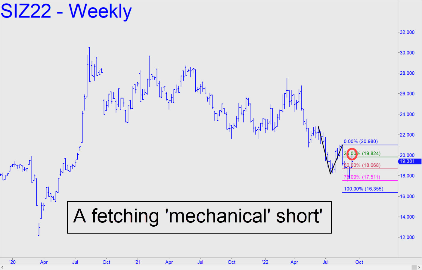 Silver triggered a ‘mechanical’ short on Friday, although I’d advised paper-trading this one. I had to redraw the chart to discover that the short was more promising than it initially appeared. I hadn’t realized that the ‘B’ low exceeded the external low from June 2020, making the downtrend more powerful than I’d originally inferred from a cursory glance. In fact, the A-B leg was quite powerful, implying that December Silver will not be able to push above C=20.98 of the downtrending pattern and eventually will fall to D=16.355. Nudge me in the chat room on Monday if shorting silver appeals to you, since we may be able to ‘camo’ ourselves aboard belatedly with risk very tightly controlled as always. (I would not have recommended using a conventional stop above C in any case, since that would have implied more than $23,000 of entry risk on four contracts.)