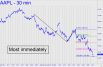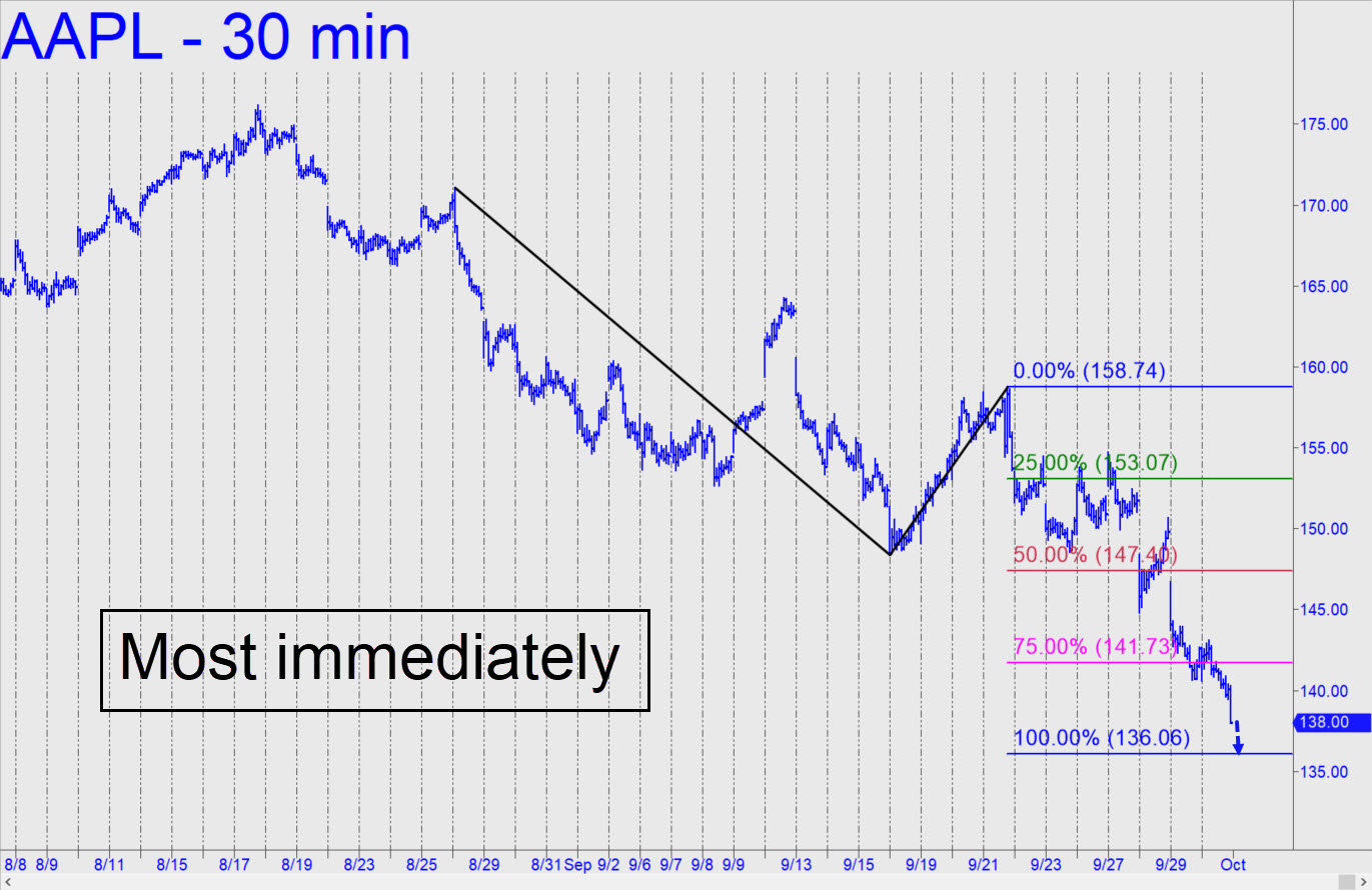 Earlier, I described in detail how the stock’s canny sponsors levitated it without risking much. This occurred mostly via short-squeeze rallies in thin, overnight markets, and with gap-up openings that allowed instantaneous leaps of $2-$4 on zero cash outlays. This trick will not work nearly as well now because perceptions concerning the company’s prospects have darkened with the onset of recession in Europe, a key market. The U.S. consumer economy is close behind, and the one-two whammy is certain to depress sales of the pricey iPhone. Rick’s Picks will continue to track AAPL closely and trade it aggressively in both directions. Get AAPL right and you get the stock market right. We’ve been doing it with consistent precision, so stay tuned. _______ UPDATE (Oct 3, 6:30 p.m.): The algos and hubcap thieves who work the night shift must be tuned to Rick’s Picks, since they front-ran my 136.06 target by 34 cents. Ordinarily I would not assume they are on a target of mine like fleas, but in this case the pattern seemed obscure enough that we shouldn’t have had much company. The subsequent short-squeeze was steep, but it suspiciously failed by a hair to impulse above Friday’s 143.10 high. That could happen tonight or tomorrow, with bullish implications for the short term, but we’ll move to the sidelines in any event.
