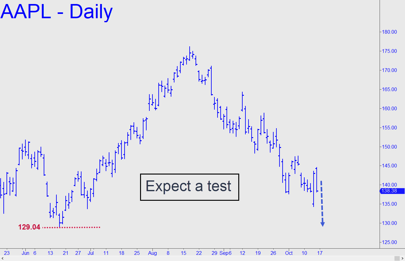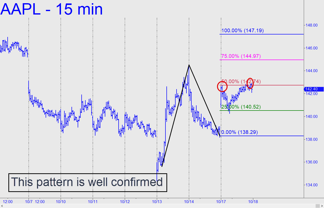 Last week’s low just pennies beneath my 134.59 target would be an unlikely place for a good bottom, as a glance at the chart suggests. The stock will want to test the June low at 129.04 to bolster confidence for the next significant bear rally. We’ll be on the alert to catch a ride north, but it’s liable to take work and patience, since AAPL could noodle around down there for days or even weeks, stopping out bulls with so many false starts that they’ll eventually give up. There’s $9 of potential downside to exploit along the way, but that too will require close monitoring of the lesser charts. A ‘voodoo’ number at 131.41 looks promising for catching a tradeable bounce, so be ready when AAPL gets there. ______ UPDATE (Oct 17, 9:05 p.m.): AAPL’s opportunistic leaps on the opening are by now so familiar that we should be shocked if DaBoyz ever attempt this money-saving trick with honest-to-goodness buying. Today’s headbutting precisely at p=142.74 confirmed the pattern and its target, 147.19. Consider it a done deal if buyer’s fist-pump their way past p, especially in the early going. An unexpected pullback to x=140.52, the green line, would trip an attractive ‘mechanical’ buy, stop 138.28. _______ UPDATE (Oct 18, 8:40 p.m.): The stock’s handlers let go of the leash, but it only seemed like they’d lost control. AAPL finished with a riskless/costless gain, leaving a classic ‘mechanical’ buy at the green line. I must confess that I was elsewhere at the time.