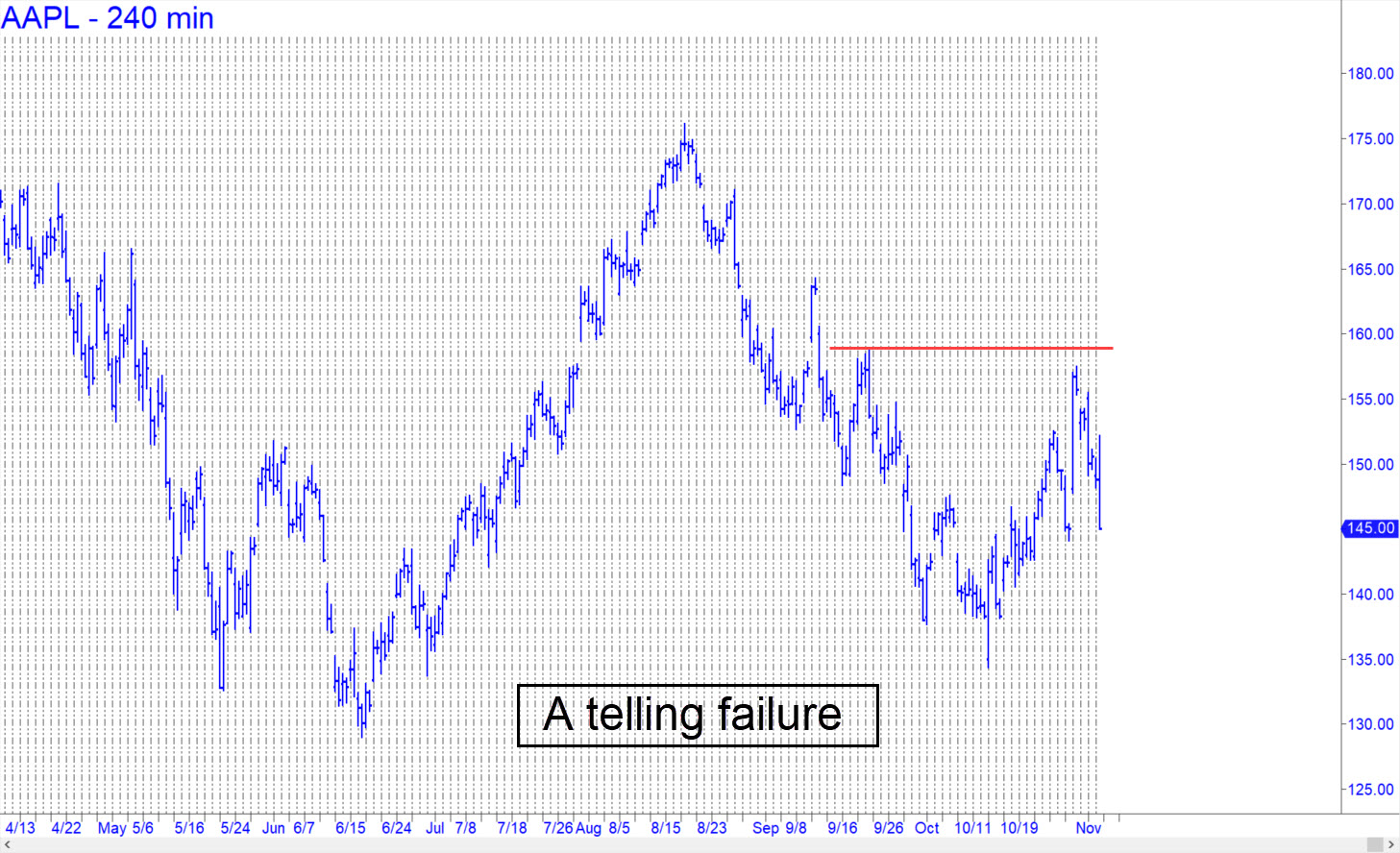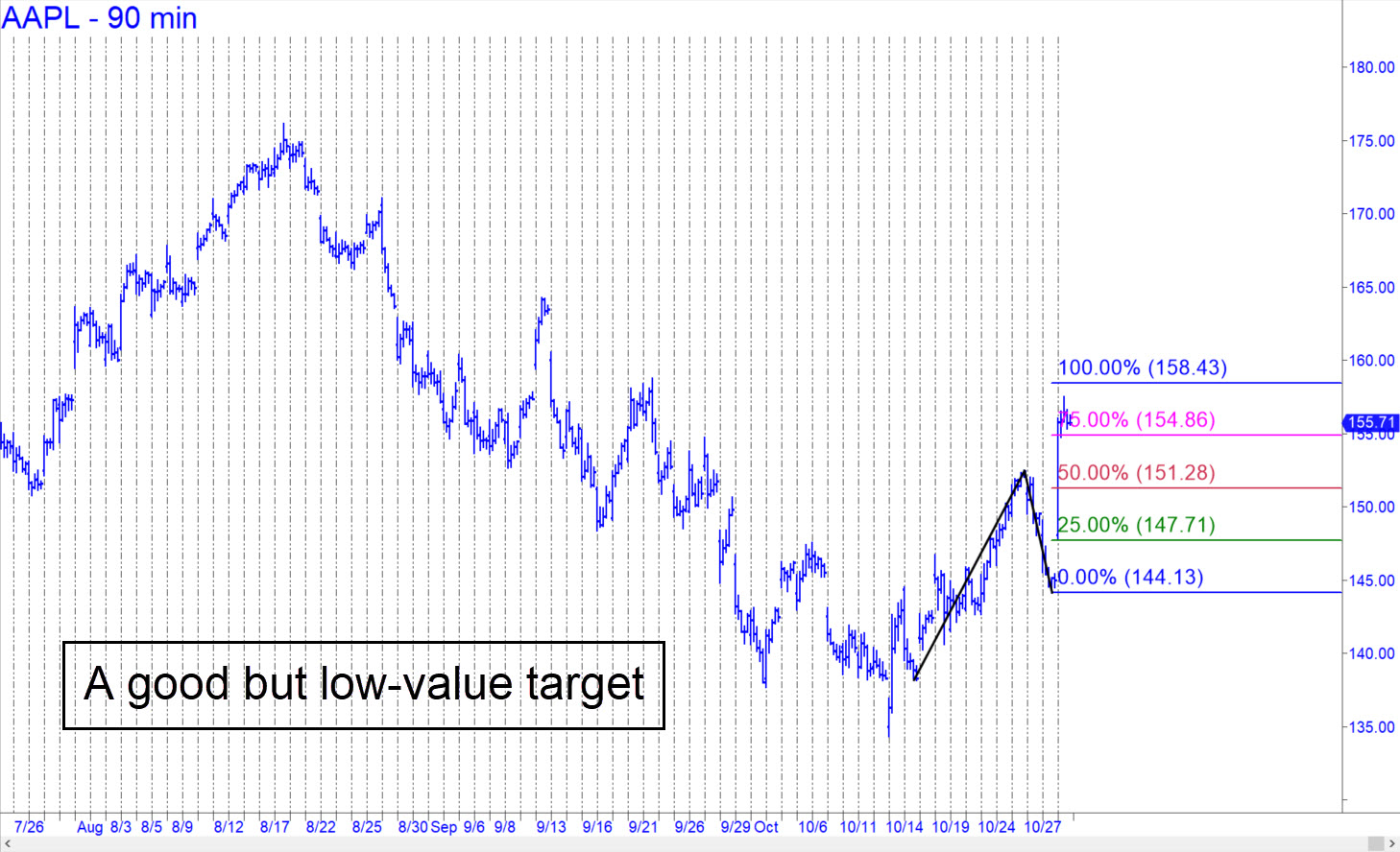 I’ve used a conventional ABC pattern to project a 158.43 rally target that looks all but certain to be achieved. Shorting there is another matter, however, since it coincides with a distinctive peak recorded on September 21 that will likely figure prominently in the plans of the algos and EDTP (electronic day-trading platform) whizzes we go up against every day. My preference would be to anchor the ‘c’ high of a reverse pattern three points above the target and to use a 14-cent trigger interval. This one’s for subscribers who are comfortable with rABC trades. _______ UPDATE (Nov 2, 4:54 p.m.): AAPL has fallen hard after failing to reach my 158.43 target, let alone push above a key ‘external’ peak at 158.74 recorded on September 21. This is a telling sign of weakness to come and a reason to be cautious about buying into rallies. Expect this selloff to continue down in to the mid $130s.