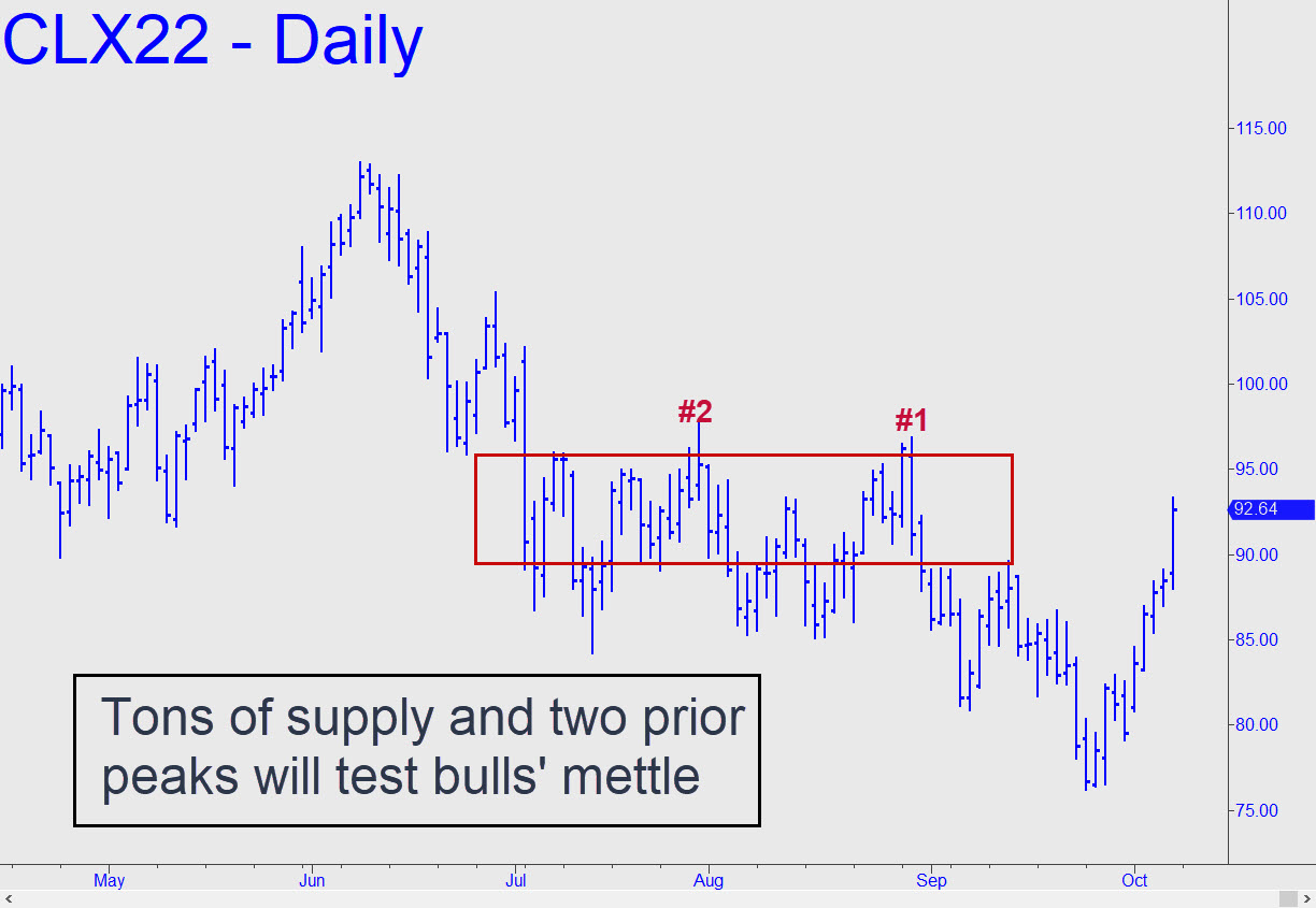 Friday’s psychotic leap took November Crude into a zone of heavy supply, where it had traded mostly within a $10 range between July and September. It seems doubtful that the mechanics who engineered the impressive short squeeze will be able to propagate another as the new week begins. However, if they do, exceeding two ‘external’ peaks at, respectively, 96.82 and 97.91 within a day or two, that would be the most bullish technical sign we’ve seen in a long time. More likely in my estimation is that the futures will bog down in a consolidation (or possibly distribution) below the peaks for an indefinite period. We’ll let price action speak for itself, however, milking it for all it’s worth no matter what happens. The trade posted in the chat room on Friday morning was an example of this, a tightly controlled short that caught the intraday high within three cents.