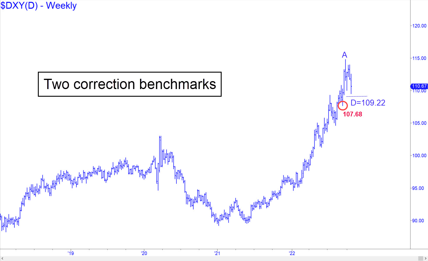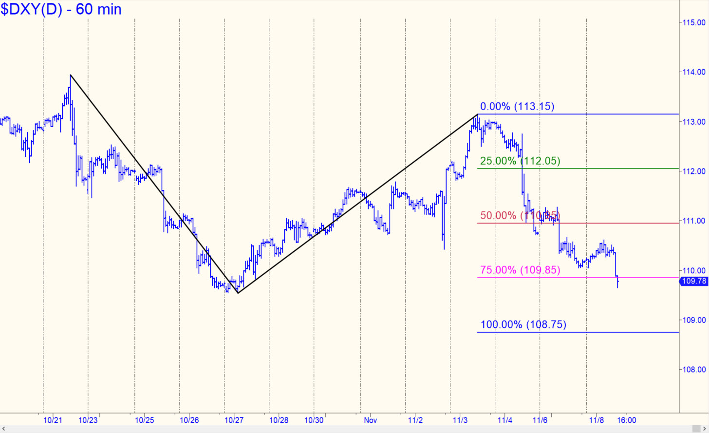 The long-term chart shows why the month of weakness we’ve seen so far may not be enough to correct the moon shot begun in mid-2021. Just a little more selling will bring the Dollar Index down to a Hidden Pivot target at 109.22 that has served as a minimum downside objective for the last two months. However, the downtrend would need to surpass the ‘external’ low at 107.68 to turn the weekly chart bearishly impulsive. For now, let’s see how the ‘hidden’ support at 109.22 handles whatever pounding occurs there if the dollar relapses. _____ UPDATE (Nov 8, 11:10 a.m.): Price action over the last two days has provided a new ABCD pattern with a 108.75 target. I expect DXY to get there, and also to reverse off a low within a few ticks. Here’s the chart. _______UPDATE (Nov 10, 8:51 p.m.): Following a steep dive on the opening bar, DXY got traction at 108.75, but this ‘hidden’ support’ failed and it plunged anew to 107.71. This suggests more weakness ahead, but a push above 109.09 to end the week would earn dollar bulls a reprieve.