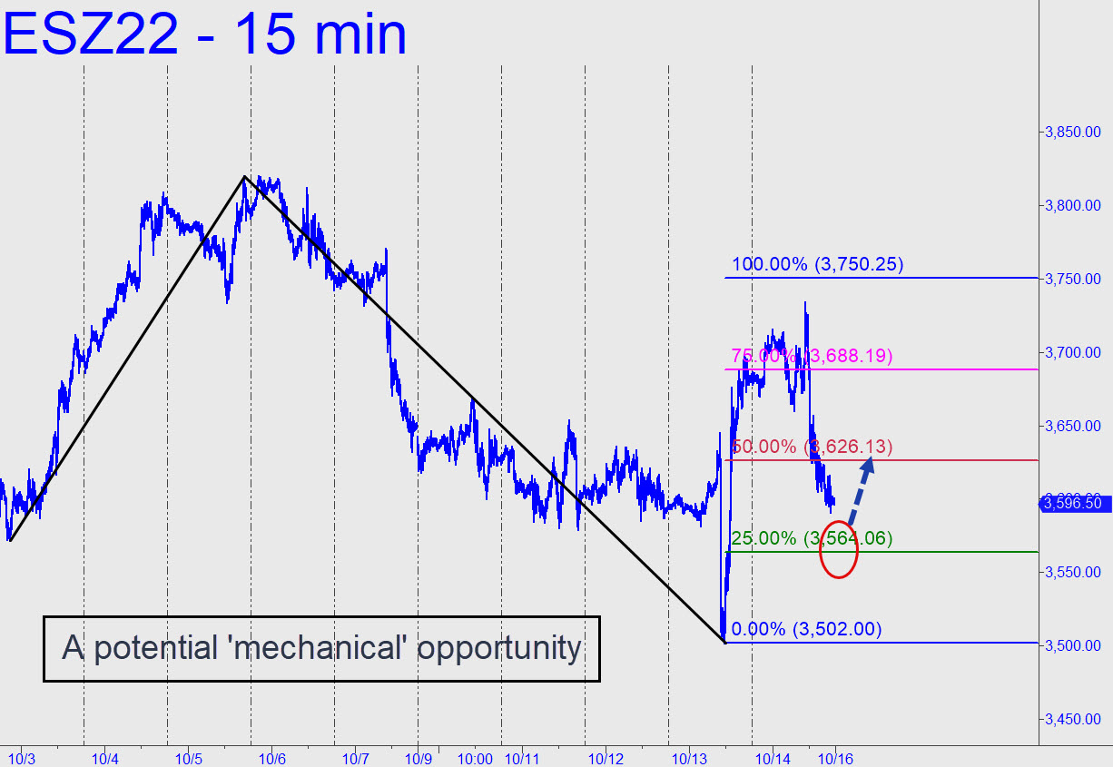 Mr Market screwed with bulls’ and bears’ heads Friday, falling steadily and hard after making an intraday high just ahead of the opening bell. In the chat room, we anticipated this with jackpot bet recommendations in AMZN in AAPL that involved the purchase of puts early in the session. There were no significant rallies intraday, nor even the customary attempt by DaBoyz to put the squeeze on shorts in the final hour. Although this would have caused bulls to back away rather than gamble on a felicitous opening Sunday evening, the futures paradoxically would have generated an attractive ‘mechanical’ buy signal if they’d sold off even harder and reached the green line at 3564.00 (see inset). That’s what I am recommending, provided you’re comfortable enough with ‘reverse-pattern’ trades to set up this one with entry risk held to no more than $150 per contract. A conventional entry, bidding at x with a stop at 3501.75, would not be appropriate because the initial risk would be around $3100 per contract.