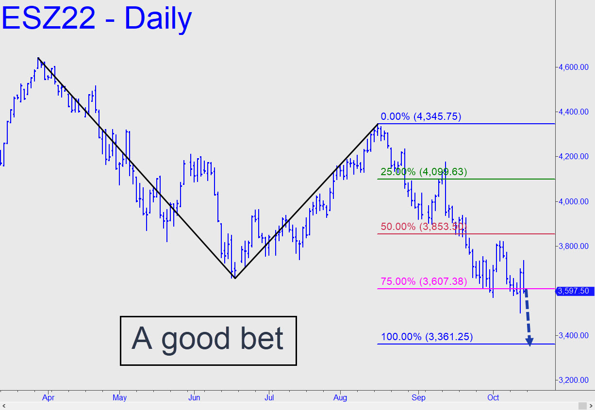 I am aware that many are bracing for a possible crash this week based on the widely circulated prediction of a guru who uses the lunar calendar. I doubt he’ll be right, since forecasts that get as much attention as this one seldom pan out. For my part, I can see more downside to only 3361.25 over the near term, but my outlook would darken if that Hidden Pivot support is easily breached. I have been saying stocks are primed for a severe crash that could begin at any time (although probably not next week for the reason given). The first sign of this would appear if, as noted above, the 3361.25 ‘hidden’ support is easily exceeded, especially on a closing basis soon after it is initially touched. Regardless, this number can be used to bottom-fish, even if the higher Hidden Pivot support at 3564 gets taken out. _____ UPDATE (Oct 17, 8:49 p.m.): With the futures moving higher, I’ll recommend shorting this gas bag with a reverse-pattern c’ anchored within 1.00 point of 3750.25. Your trigger interval (i.e., the distance between ‘c’ and ‘x’) should be no wider than 1.75 points. See my 12:50 p.m. post in the Trading Room for additional comments. This trade is for Pivoteers who are familiar with rABC/camouflage set-ups and is not recommended for beginners. Theoretical entry risk on four contracts would be around $350. _____ UPDATE (Oct 18, 8:30): The trade failed to trigger after the futures blew past my benchmark. I doubt this rally is destined for greatness, but I’m going to step away regardless, since it is starting to grate on my nerves. It is easily tradable nonethelsss using reverse patterns of small degree.