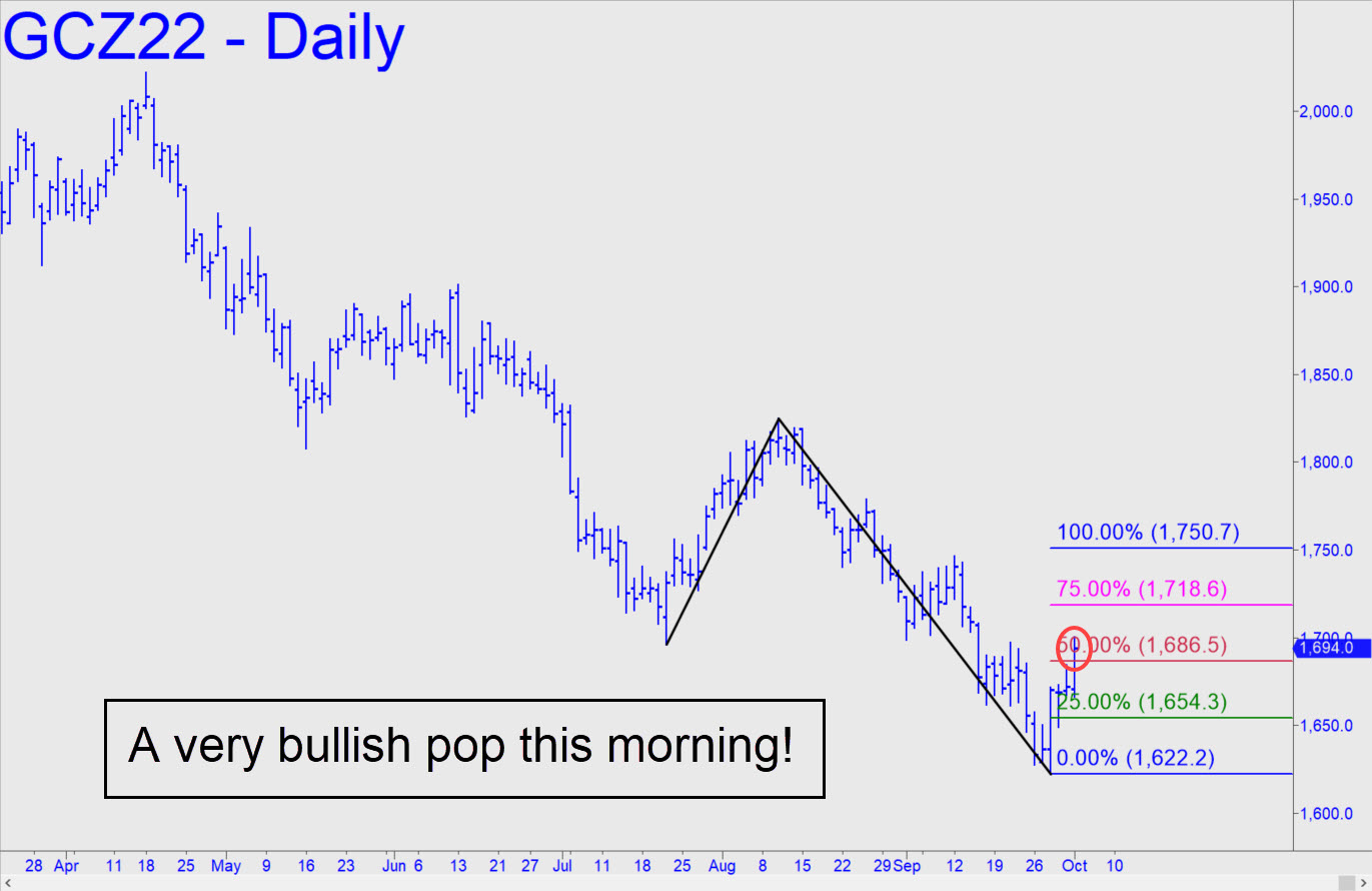 Gold has impaled a significant midpoint Hidden Pivot resistance at 1686.50 with this morning’s strong upthrust, clearing an easy path for more upside to D=1750.70. This tout updates an earlier one that displayed the wrong chart, but it also has given me an opportunity to acknowledge the very bullish price action witnessed in the last two hours. The pattern will yield excellent odds for bottom-fishing any swoons with a ‘mechanical’ bid, but if the opportunity fails to develop we can still buy on the way up using other tactics (which could conceivably include a small-pattern ‘mechanical’ entry).