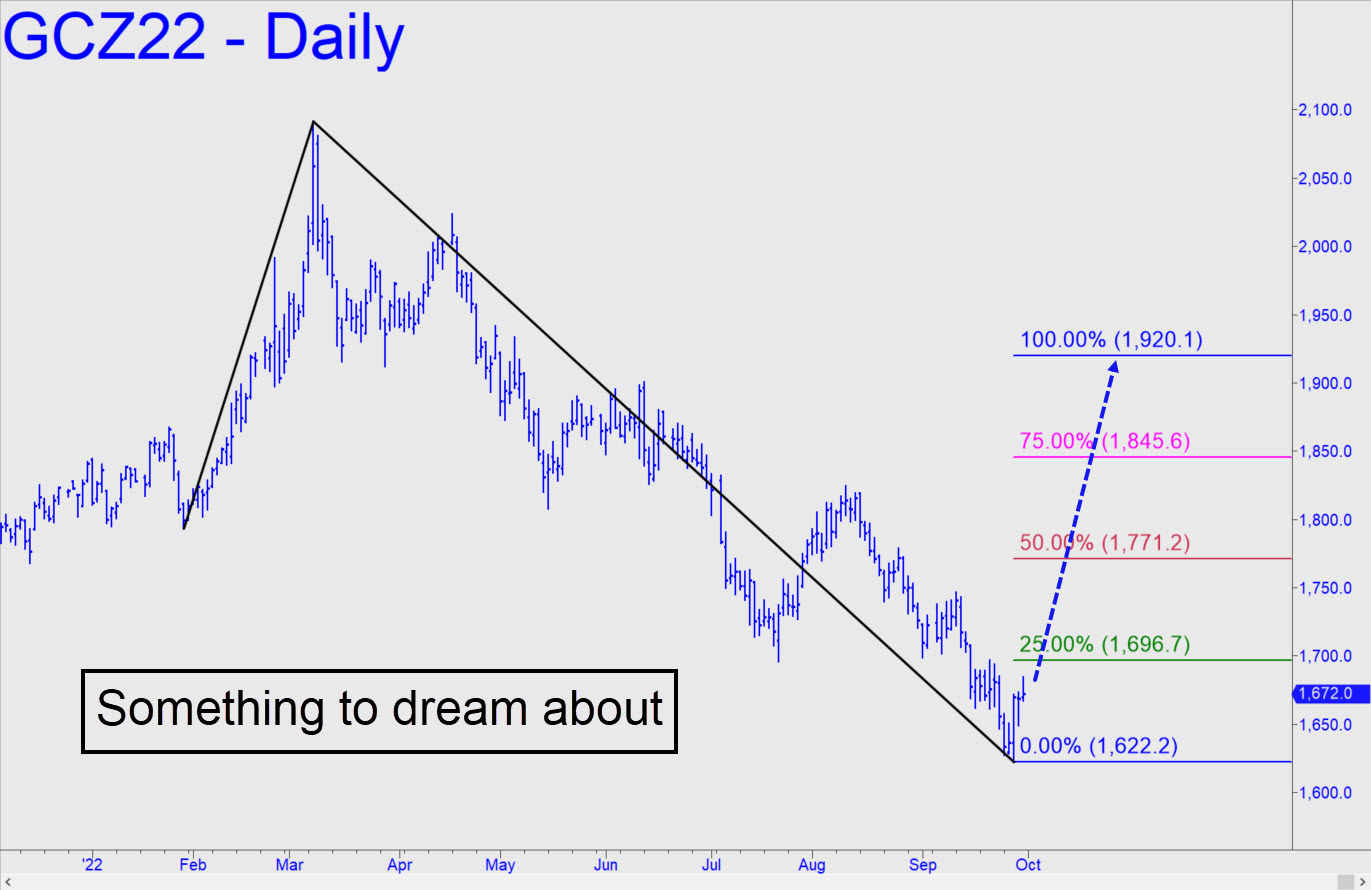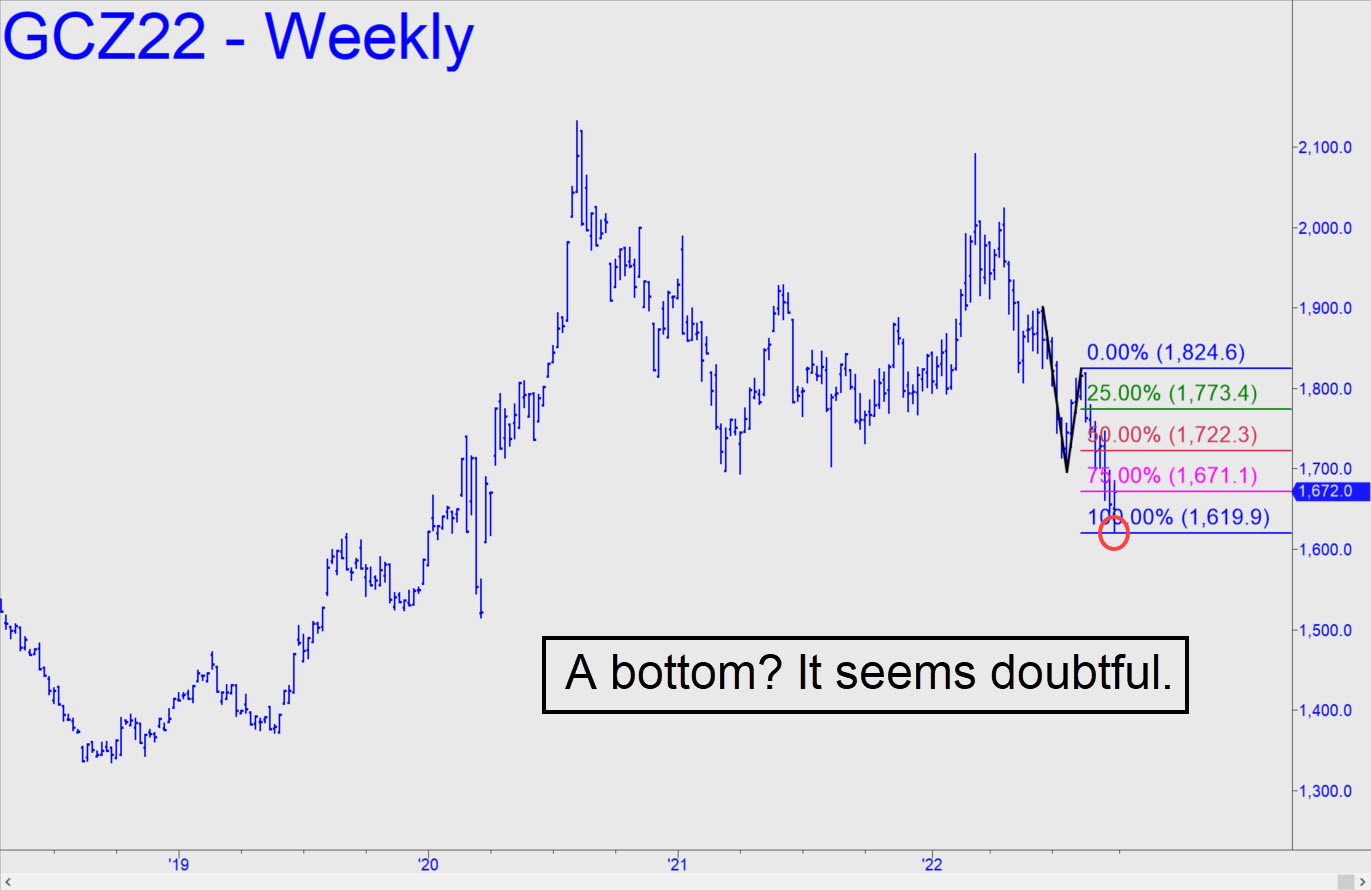 Thereafter, a pullback to the green line from our sweet spot between p and p2 should be bought ‘mechanically’ provided you know how to hold the entry risk down to less than $250 per contract. In the unexpected event that the rally exceeds D=1750.70, that would be the most bullish sign we’ve seen in a long while. It would bring into play a larger reverse pattern (a=1802.10 on 2/3/22) that projects to at least 1766.90, or 1911.50 at the outside. The foregoing notwithstanding, my gut feeling is that gold is about to relapse, eclipsing last week’s low at 1622.20. Not far below it is a voodoo number where I’d try bottom-fishing, but I’ll say no more about it until such time as the futures get there.