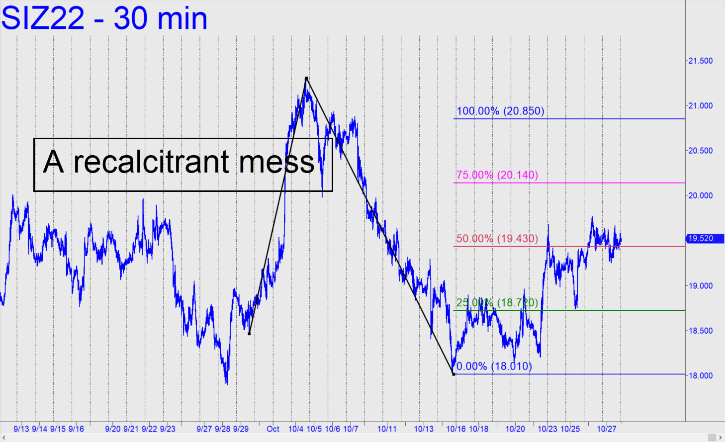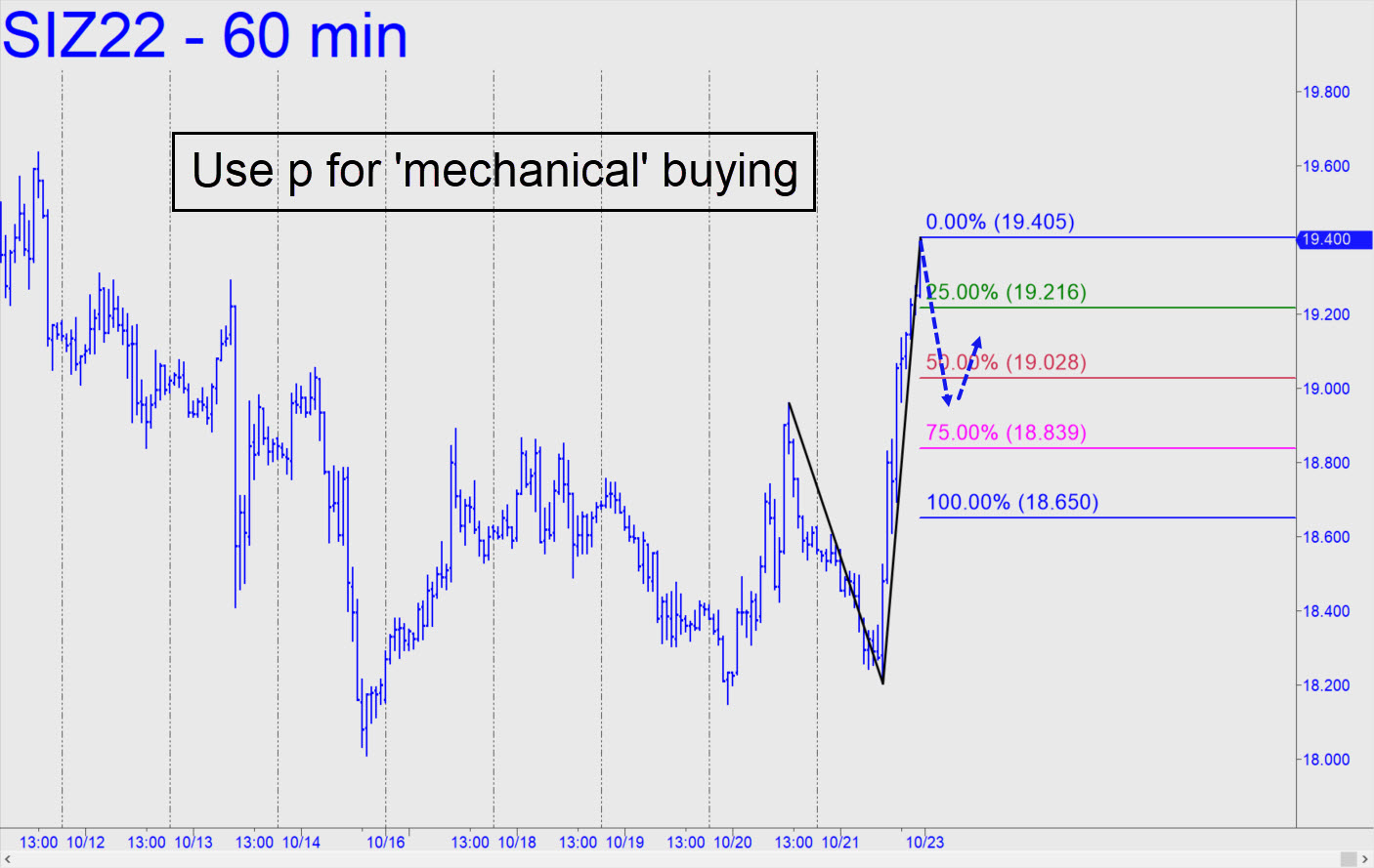 Buyers’ wilding spree on Friday was even more impressive than in gold. Accordingly, you should use the bullish ‘reverse pattern’ shown to get long with risk very tightly controlled. Buying should be done on a pullback to p=19.03, stop 18.90, much just as I’ve advised in December Gold. However, please be aware that you can cut risk even more by setting up an rABC trigger on a lesser chart, with the ‘c’ low anchored within two cents of p. The midpoint pivot shown is tentative and would change if December Silver moves higher Sunday evening, but the ‘conventional’ stop-loss would remain fixed nonetheless at 12 cents below the final p used for entry. This trade is easier than it sounds, but it is recommended only for subscribers who have been attending Wednesday tutorial sessions and understand how rABC set-ups work. _______ UPDATE (Oct 24, 5:02 p.m.): See my chatroom posts and chart from 9:55 a.m. Tuesday morning. _______ UPDATE (Oct 27, 7:24 p.m.): December Silver appears to be dragging itself kicking and screaming toward the 20.85 Hidden Pivot target shown, but what a mess!