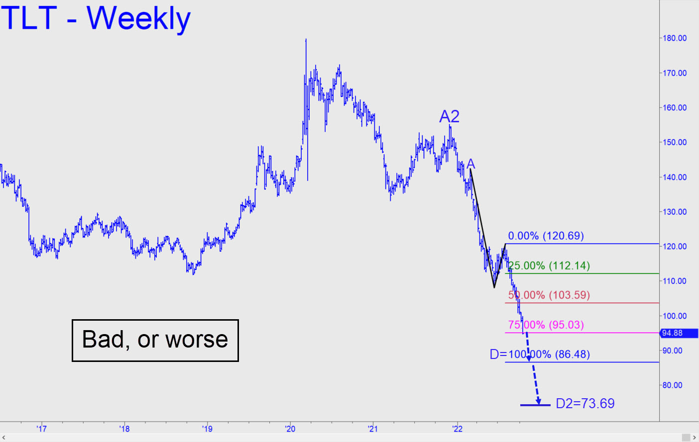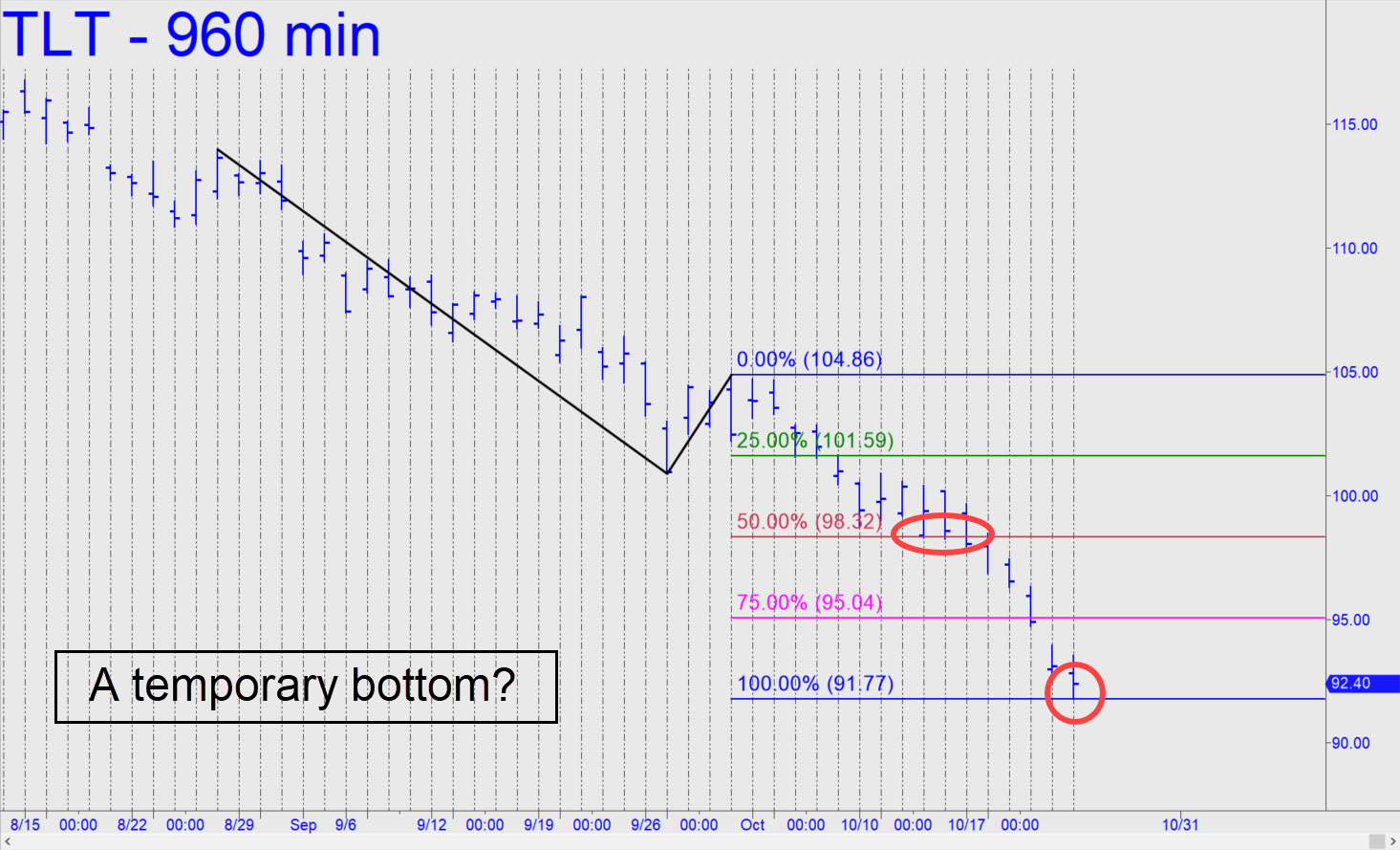 TLT’s decisive breach of the 97.19 midpoint support earlier this week (see inset) implies it will continue falling to at least 86.48, or perhaps even to 73.69 if that secondary Hidden Pivot support fails. These numbers correspond on the weekly chart to 30-Year interest rates of, respectively, 4.20% (achieved today, presumably slightly out-of-synch with TLT) and 4.65%. That last number, my worst case, is lower than the 4.90% I’d estimated earlier, but it appears to be a good target for a potential top. _______ UPDATE (Oct 24, 4:32 p.m.): I hadn’t noticed this pattern earlier, but it is mildly promising for a temporary bottom at D=91.77. This Hidden Pivot target was effectively fulfilled with today’s 91.85 low, but there was little to encourage in the so-far weak bounce that has followed. The pattern was confirmed by the precise bounce from p=98.32 which would have made today’s price action worth bottom-fishing.