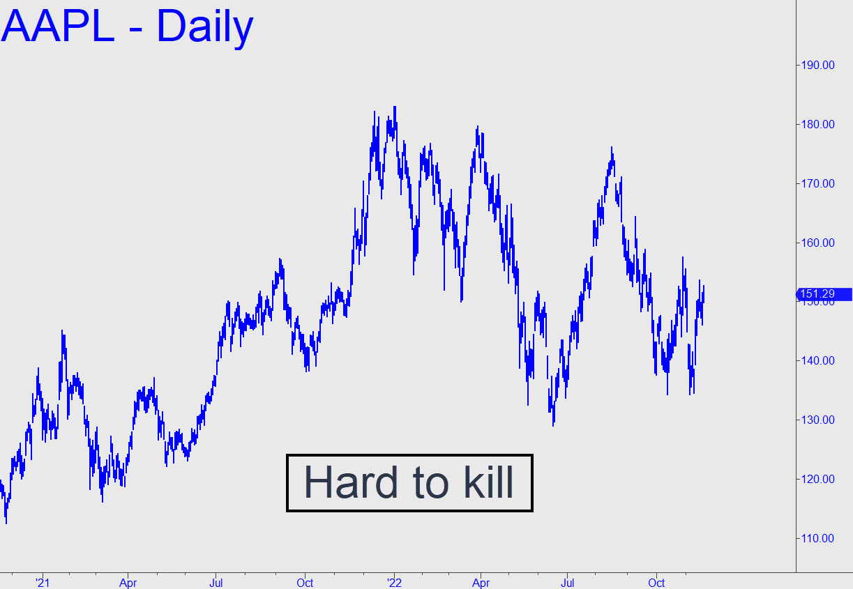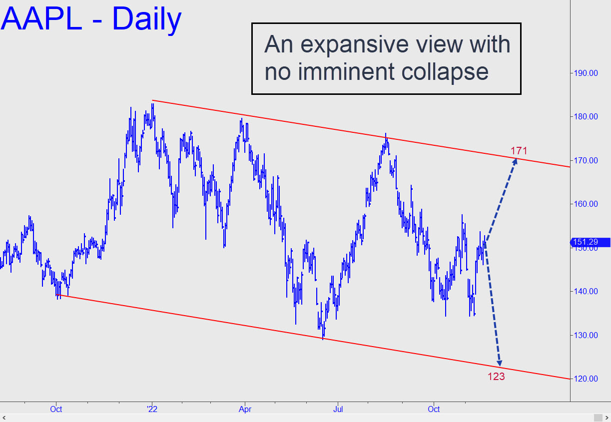 You don’t need to be chartist to see that Apple is not about to go quietly into the night. Since the beginning of the year, every worrisome selloff has been answered by a rally of nearly equal breadth. The stock’s long list of sponsors includes virtually every giant investment fund on the planet, many of them sovereign funds with no foreseeable need for quick cash. It is predictable that they will support the stock for as long as possible, presumably until they are overwhelmed by redemptions by individual investors grown mortally fearful of plummeting iPhone sales. That could only occur in the throes of a deep and prolonged global economic downturn, and even then over a months-long period of disillusionment. Rather than proffer a chart for trading purposes this week, the inset shows a channel that could define the limits of the stock’s ups and downs in 2023. However, odds would tilt toward a breakout above the upper channel line if the current rally, begun from 134 two weeks ago, surpasses September 12’s 164.26 high without correcting to the lower line that currently comes in at around $123.