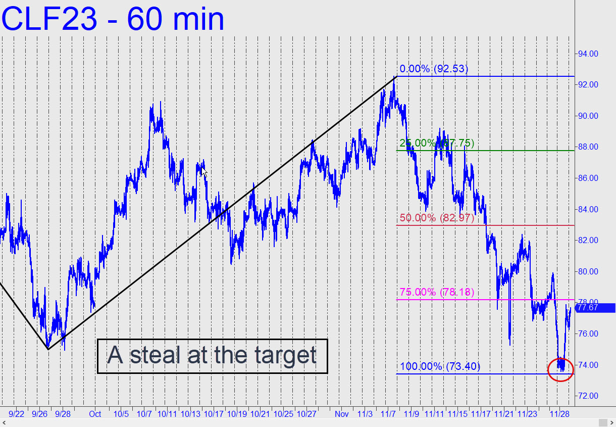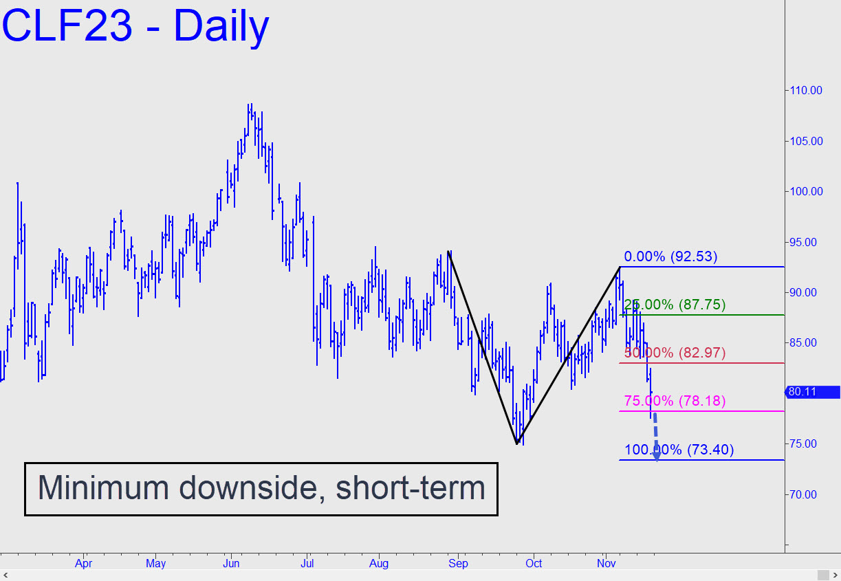 Sellers drove the January contract down through the midpoint support at 82.97 with such force that a further fall to at least D=73.40 appears all but certain. We’ll consider getting short ‘mechanically’ if there’s an intervening rally to the green line (x=87.75), or even to p=82.97, but a bottom-fishing opportunity at D seems more likely at present to materialize. If that Hidden Pivot support gets crushed, expect more downside to at least 70.00, or even to 66.70. Both are Hidden Pivot ‘D’ targets derived from successively higher point ‘A’s. _______ UPDATE (Nov 28, 10:18 p.m.): Crude’s ballistic reboundĀ from within an inch of the 73.40 downside target drum-rolled above allowed at least one subscriber to report a $1650 profit in the chat room. I see no such lay-up possibilities today, so we’ll give it a rest.