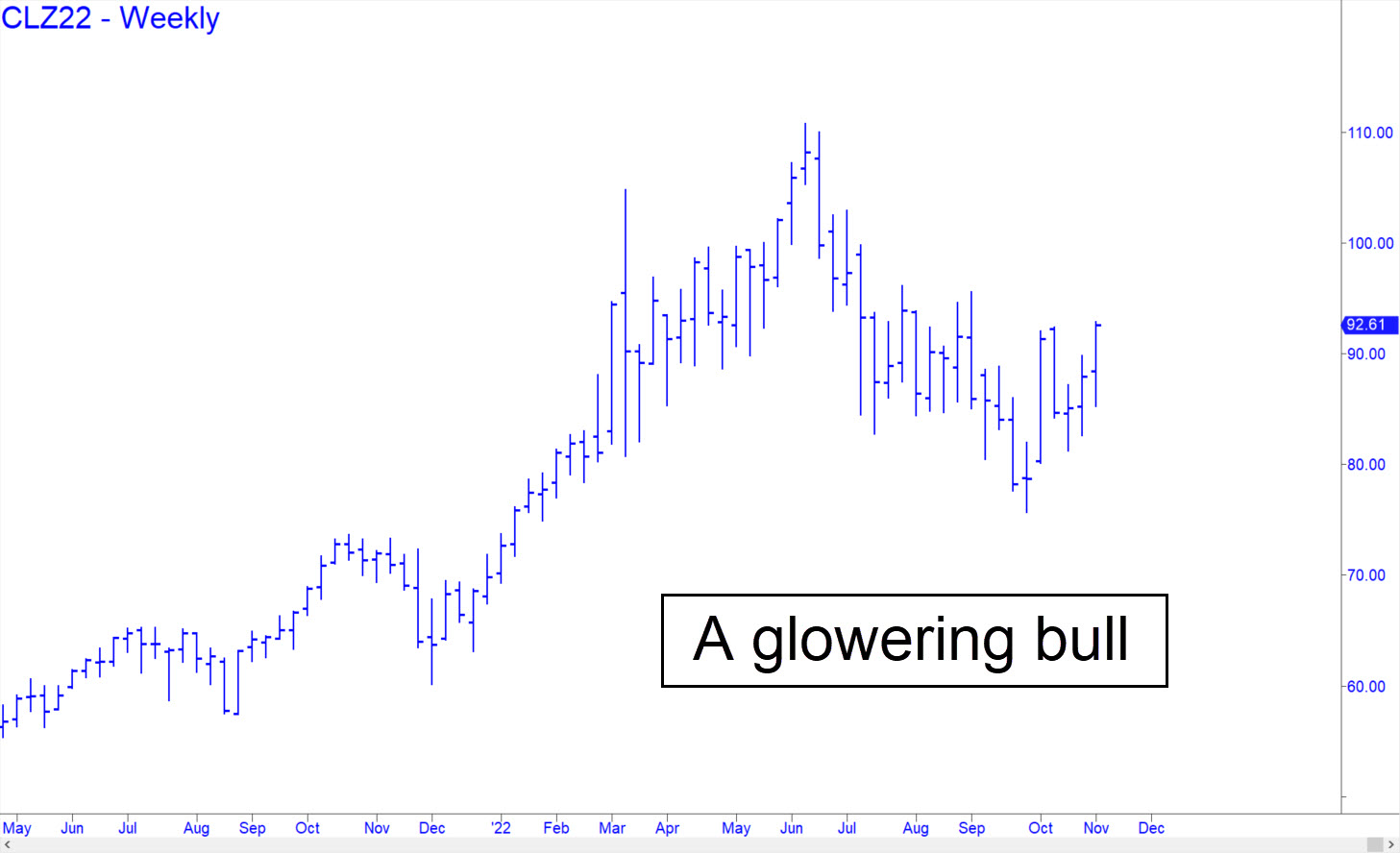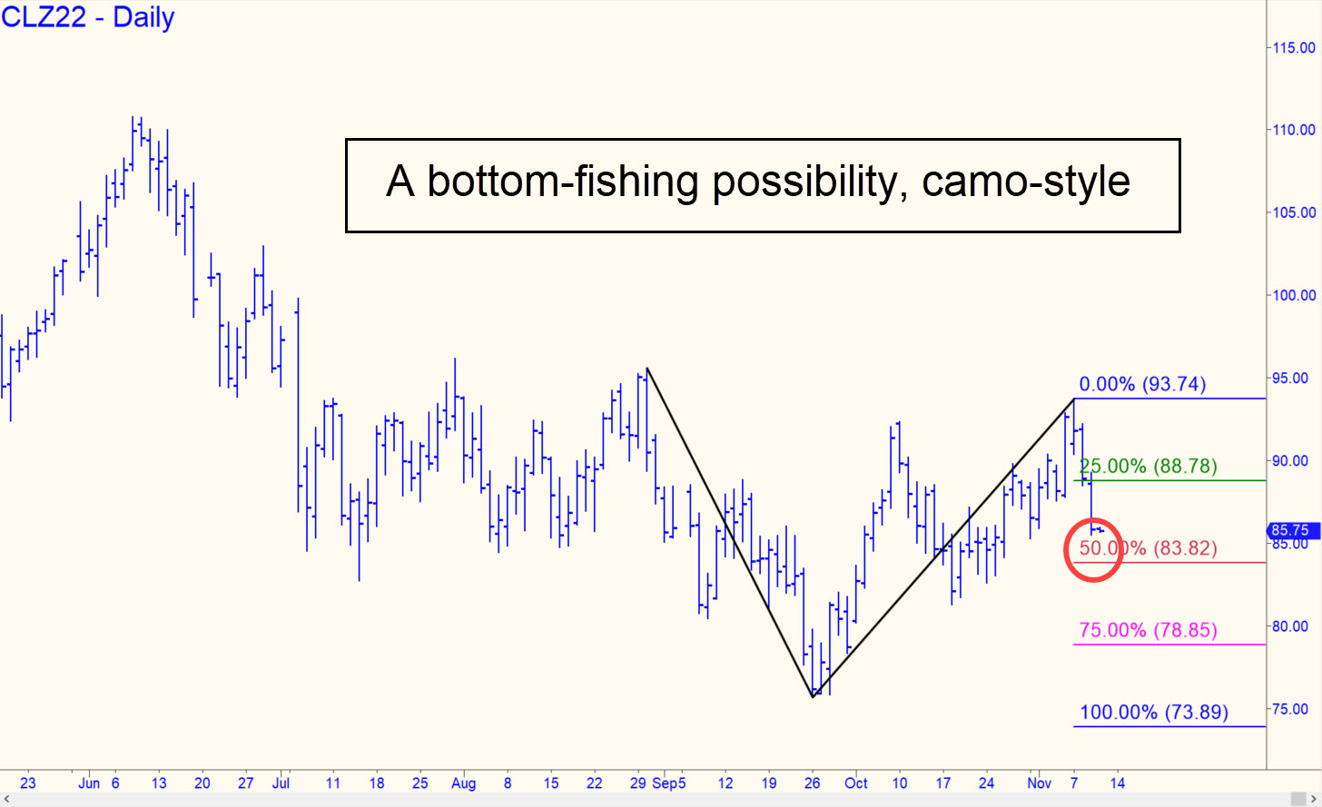 This week’s chart would seem to hold little encouragement for the many who have been praying for fuel price to come down. Unfortunately, December Crude appears to be basing for a run-up to as high as 123.34, but at least to 99.52. The lower target somewhat exceeds the 95.28 target of a smaller pattern we’ve been using to keep us on the right side of the market. Although I expect a tradeable pullback from there, I doubt it will get very far. I can also see opportunities for shorting successfully on the way up, but going with the trend, as always, will be more difficult. The prospect of fuel prices going even higher as winter encroaches is scary. A relapse in the price of December Crude to beneath the September low at 75.70 looks possible, but sellers would first have to take out a prior low on the weekly chart to make it happen. The nearest lies at 81.30. _______ UPDATE (Nov 9, 6:53 p.ml.): The rally died in an interesting place, just pennies shy of a ‘voodoo’ number and well short of the key high at 95.55 recorded in late August. This leaves me more open-minded to the possibility of a plunge to as low as 79.89, an event that I could understand more easily than sky-high targets with the global economy sinking into recession-or-worse. Here’s the target pattern — and yes, you can us p=83.82 to anchor a reverse-pattern trigger to bottom-fish there.
