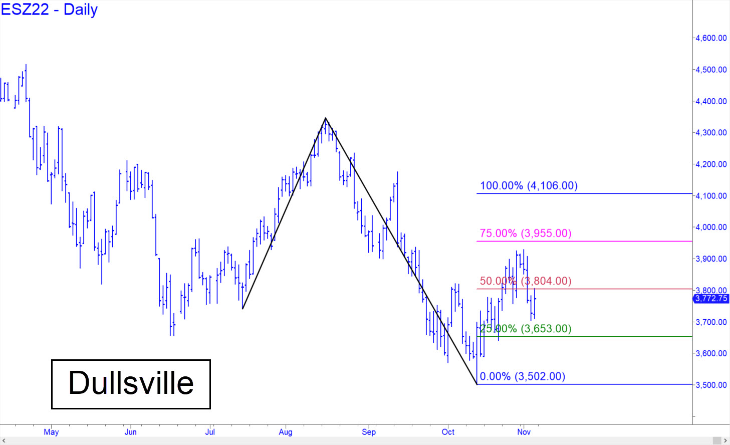 With a crucially important election looming, the S&Ps were understandably subdued, since no one knows what the vote will bring. I’d recommended getting long ‘mechanically’ if the futures pull back to the green line (x=3653), but this should be done only by those with the technical chops to cut the implied, $30,000 entry risk down to perhaps $1,200 or so. This recommendation implies that after touching the green line, the futures will be more likely to rally at least to p=3804.00 than they are to fall beneath 3502.00, the reverse pattern’s point ‘c’ low. _______ UPDATE (Nov 10, 12:43 p.m.): See my 12:24 post and follow-up in the chat room for a current view.