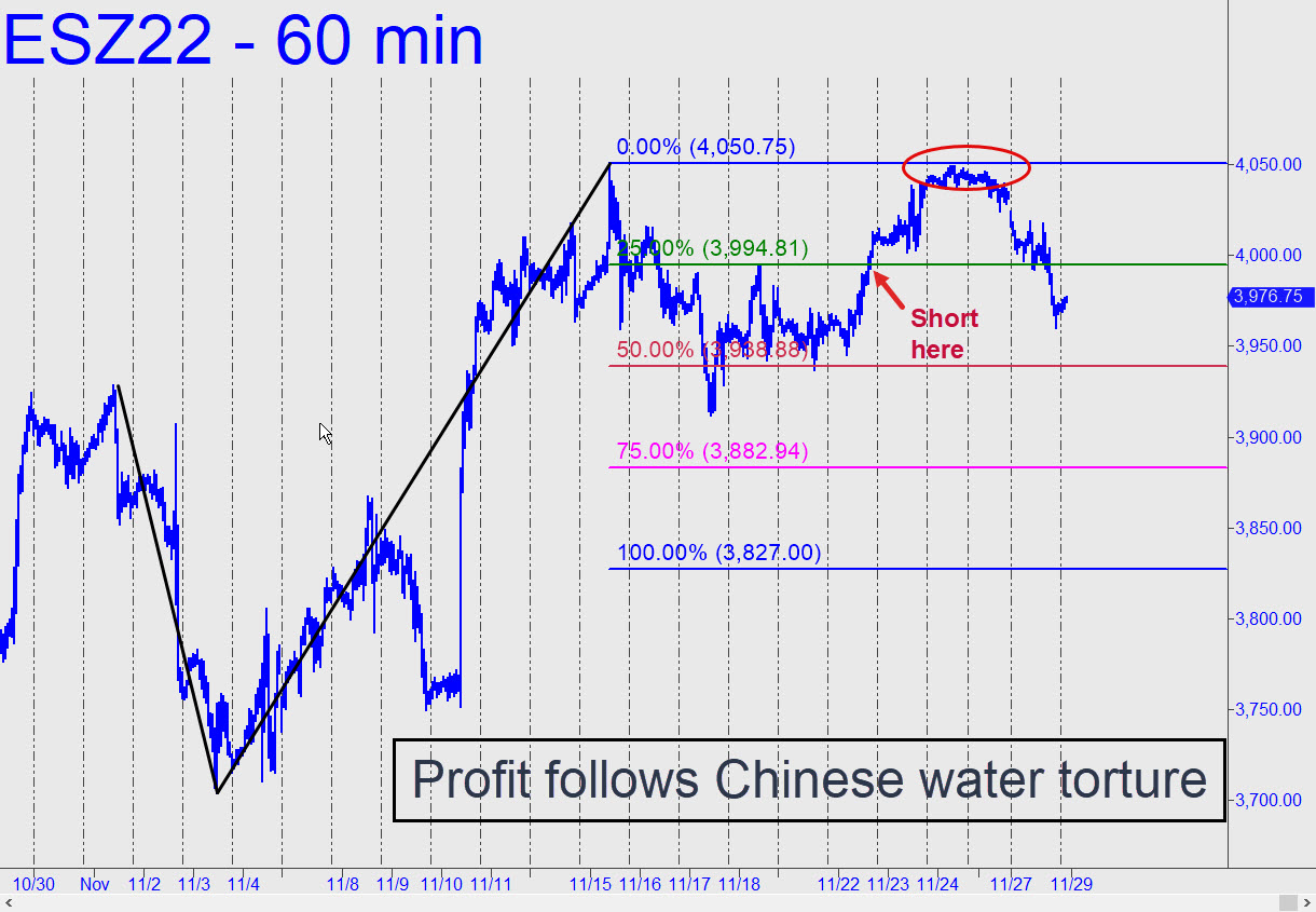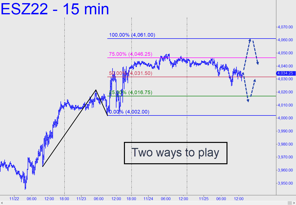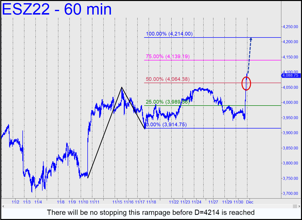 The off-kilter pattern shown, with a weak A-B segment that obscures the chart’s ‘mechanical’ appeal, yields a picture that could provide two trading opportunities as the new week begins : 1) a ‘mechanical’ buy at the green line (x=4016.75), stop 4001.75; or, 2) a short at D=4061.00 with a stop-loss as tight as 1.50 points. The first looks more appealing but would require a ‘camouflage’ set-up on a chart of lesser degree to shrink the implied entry risk of $750 per contract. _______ UPDATE (Nov 28, 9:46 p.m.): So much for bottom-fishing at 4016.75, a trade done in by a Sunday night air pocket that turned out to be honest-to-goodness selling. Going forward, use this corrective ‘reverse’ pattern, to gauge trend strength and trade, since it has profitability going for it, even if achieved under duress. A decisive breach of the red line (p=3938.75) would telegraph more downside top2=3882.94, or even D=3827.00, a Hidden Pivot support that can be bottom-fished with the tightest stop-loss you can craft. _______ UPDATE (Nov 30, 6:52 p.m.): Stocks screamed higher, not because of bullish buying, but because no seller would dare get in the way when the Fed is talking its book. That’s how bear rallies work, instantly adding hundreds of billions of ‘dollars’ to the financial economy without requiring any effort or even bulls to do the lifting. This short-covering binge is bound for at least 4214.00 — a near-certainty given the way it vaporized the 4064 midpoint Hidden Pivot resistance.