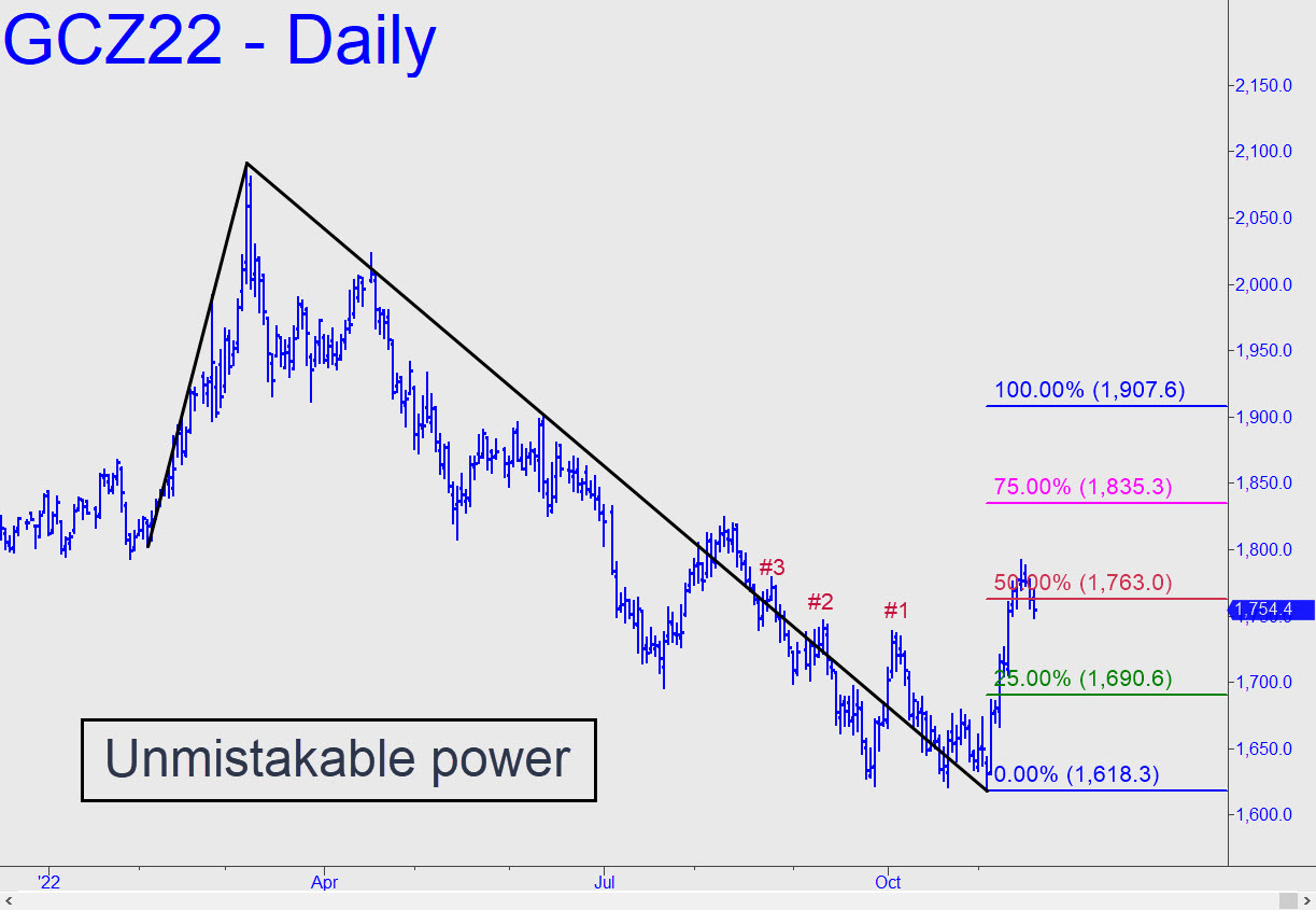 The steep ascent from the 1618 low recorded on November 3 has enough power to all but guarantee another big leg up once the initial leg has been fully corrected. It surpassed no fewer than five prior peaks, three of them ‘external’, without a visible correction on the daily chart. So that we don’t let expectations get too far ahead of reality, I’ve projected a rally target at 1907.60 that uses a somewhat conservative ‘reverse’ pattern. In the meantime, a pullback to the green line (x=1690.60) would generate an appealing ‘mechanical’ buy signal. The rally may prove too strong to gift us with such an opportunity, but we should be prepared to act if the futures swoon.