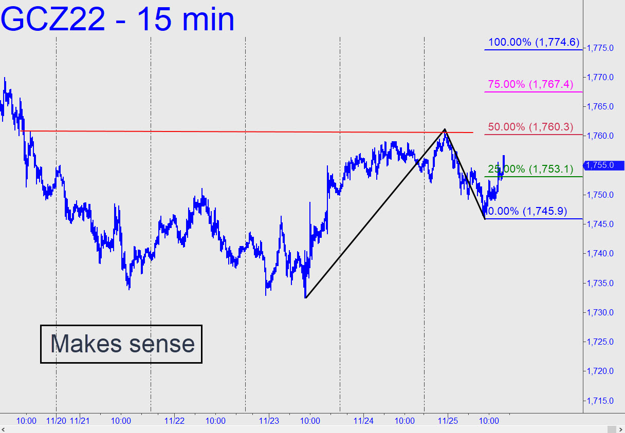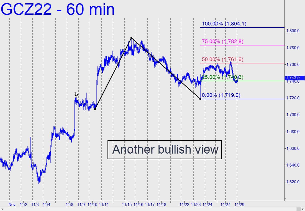 Friday’s high surpassed a look-to-the-left peak recorded a week earlier, refreshing the bullish impulsiveness of the intraday charts. The original chart contained a bad print down at 1719.00, but cleaning it up has produced a serviceable pattern with a midpoint resistance at 1760.30 that can serve as a minimum objective. A further run-up to D=1774.60 would become an odds-on bet if buyers shred their way past 1760 — or better yet, close above it for two consecutive days. ______ UPDATE (Nov 28, 9:57 p.m.): Here’s a fresh chart that salvages a bullish outlook despite today’s nasty reversal. It also treats the 1719.00 low of last Wednesday’s wack-o downdraft as though it actually happened, which appears to be the case. The chart has signaled a so-so ‘mechanical’ buy at x=1740.30 (stop 1718.90) off an intraday high that did not quite reach our sweet spot around 1772.00. ______ UPDATE (Nov 29, 11:02 a.m.): Here’s an update on that last chart. It shows the February contract with a D target at 1818.50. Precise play off p=1776.00 suggests this pattern will work well for trading and assessing trend strength. It has already yielded a ‘mechanical’ buy at the green line that could have been worth as much as $2000 per contract overnight.