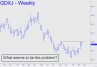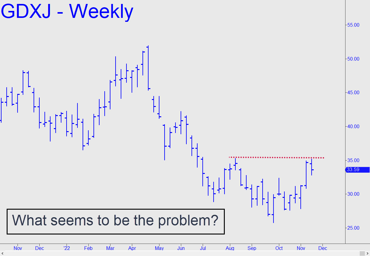 Relative to physical, this junior gold proxy underwhelmed investors last week. The disappointment was palpable on Friday, when GDXJ opened just off the previous day’s high and traded slightly above it, only to fail by 10 cents to surpass a distinctive ‘external’ peak at 35.26 recorded back in August. Will it make amends by impulsing above the peak on Monday? Any less would be a discouragement, since buyers shouldn’t need a running start from lower levels to accomplish this unchallenging feat.