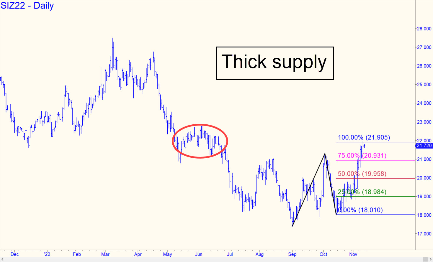 Friday’s blitzkrieg rally capped a whole month of gingerly stair-stepping. Would you believe that all of it did not push the futures past a single ‘external’ peak on the daily chart, let alone generate an impulse leg? The good news is that it would require a further push of just 82 cents to create a quite promising one. The chart (see inset) clarifies this with a peak I’ve circled at 21.74 that was recorded at the end of June. It may not look like much, but it is as significant technically as most of the more obvious peaks on the chart. I’ve set an alert there, and bulls should take heart if it gets triggered this week (the earlier the better). _______ UPDATE (Nov 10, 8:33 p.m.): The futures topped almost exactly at the 21.90 target I posted in the chat room at 8:44 a.m., so they are due for a rest. However, the subsequent pullback has been shallow so far, implying bulls are still revved up. They will have their work cut out for them trying to make headway over the next few days, though, since the uptrend has entered a thick band of supply deposited last spring between 21.72 and 22.76 (corrected) . We’ll be better able to judge the staying power of the rally once we’ve seen how it fares ‘in the zone’.