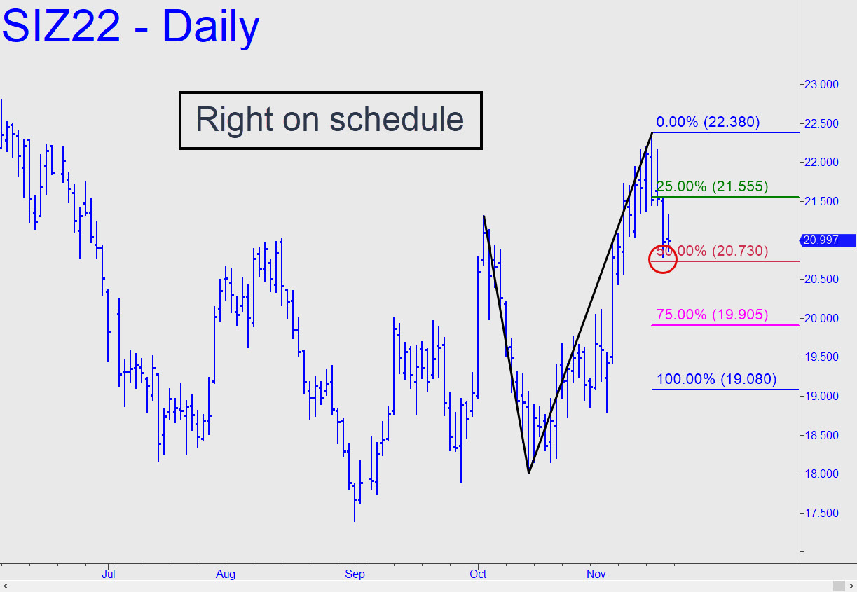 Although I expect Silver to continue moving higher, I’ve displayed a mildly bearish reverse-pattern (see inset) because it promises to work well for augmenting long positions with risk under tight control. On Thursday, for instance, sellers corrected the December contract down to the red line (p=20.73), almost triggering an enticing ‘mechanical’ buying opportunity. (It didn’t trigger, however, because the downswing missed touching p=20.730 by a hair). Let’s watch to see how the futures interact with this pattern, which could prove useful in any event. A decisive downside penetration of p early in the week could be warning of more slippage to p2=19.905, or even d=19.08. _______ UPDATE (Nov 21, 9:50 p.m.): Bottoming action at p was tricky, but there were several ways to have gotten aboard without much pain. As much as 13 cents was risked initially, but the bounce so far has delivered a profit of as much as 42 cents ($2100) per contract. Minimum price objective: 21.50. Please let me know if you hold a position based on my recommendation do I can determine whether to establish a tracking position.